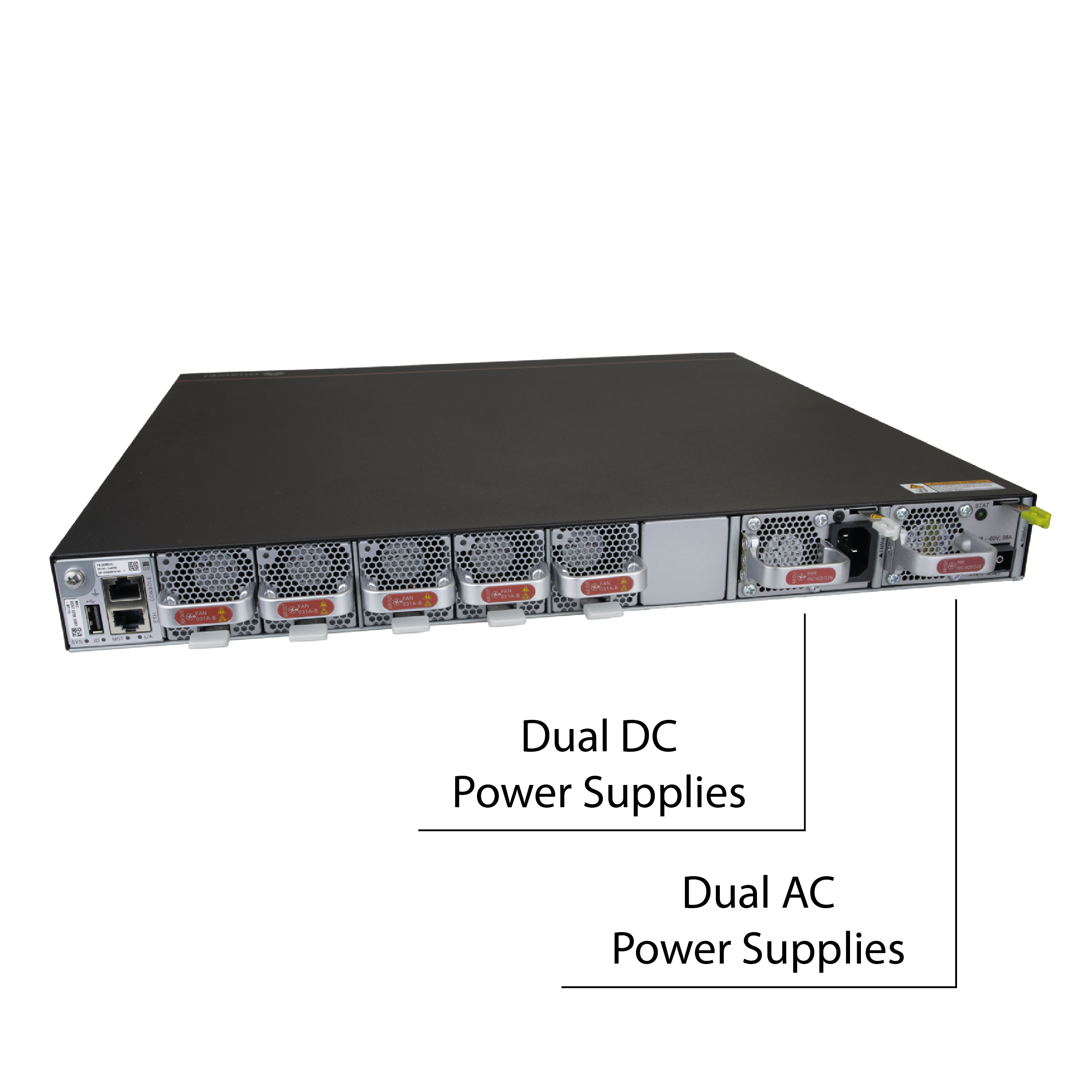 El dispositivo cuenta con una carcasa adaptada para su montaje en un armario Rack 19" e incluye los accesorios de montaje necesarios. La refrigeración activa se realiza mediante 5 módulos de ventilación con circulación de aire front-to-back: el aire se aspira desde los puertos y se expulsa por la parte trasera. El conjunto incluye un módulo de fuente de alimentación PAC1K2S12 y un módulo PDC1K2S12. Ambos módulos pueden funcionar de forma redundante; en caso de fallo de uno, el otro asume el control. El rango de tensión de entrada del PAC1K2S12 es de 100-240 V AC, y el del PDC1K2S12, de -48 ~ -60 V DC. El consumo máximo del switch es de 200 W, y el consumo típico con una carga del 30 % es de 165 W.