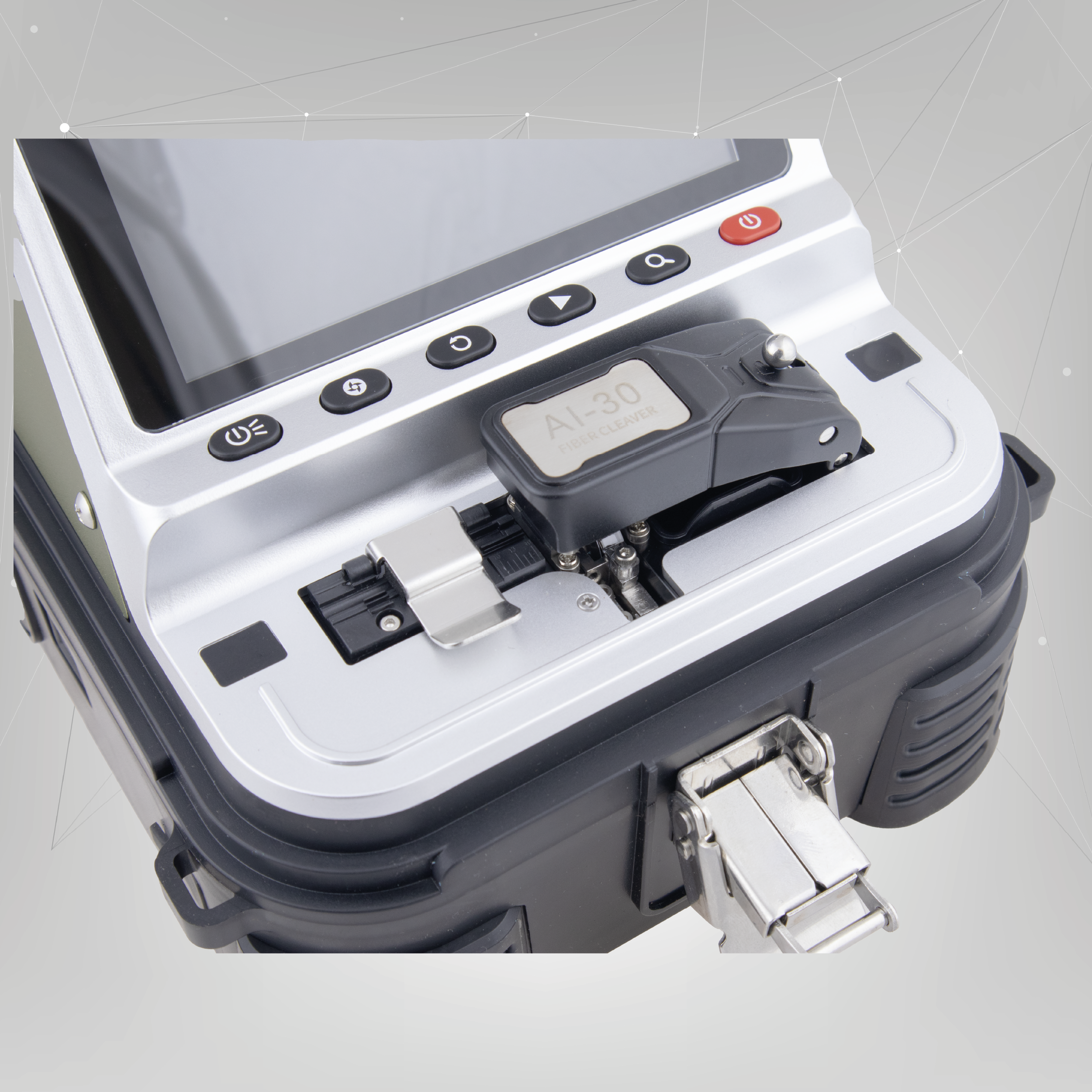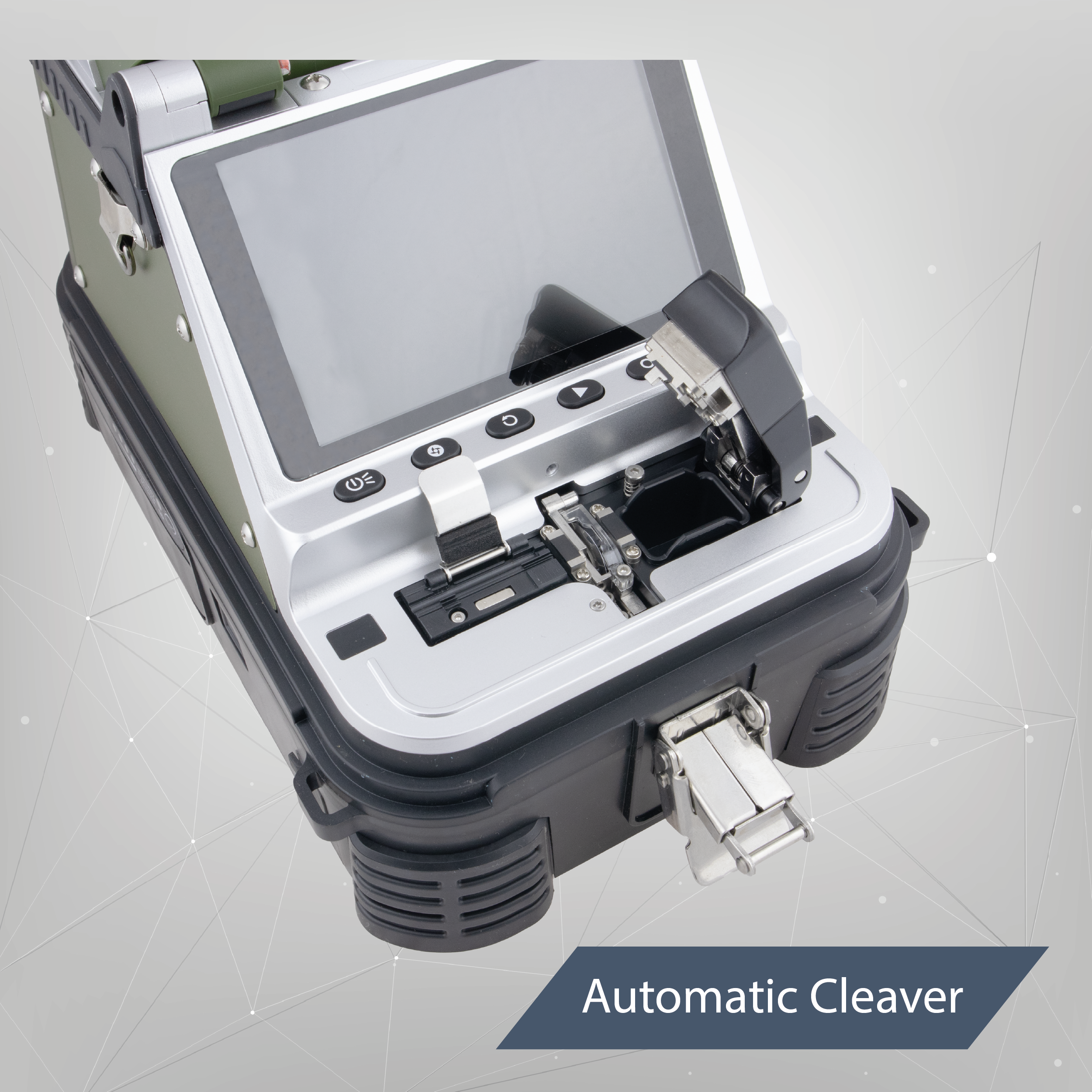 The splicer’s body includes a built-in cleaver for cutting optical fibers. It operates fully automatically: pressing down the cover performs the cut, and opening the cover returns the cleaver to its starting position. The integrated cleaver significantly increases user convenience, allowing you to immediately place the prepared and cut fiber into the holder, which is located within close reach.