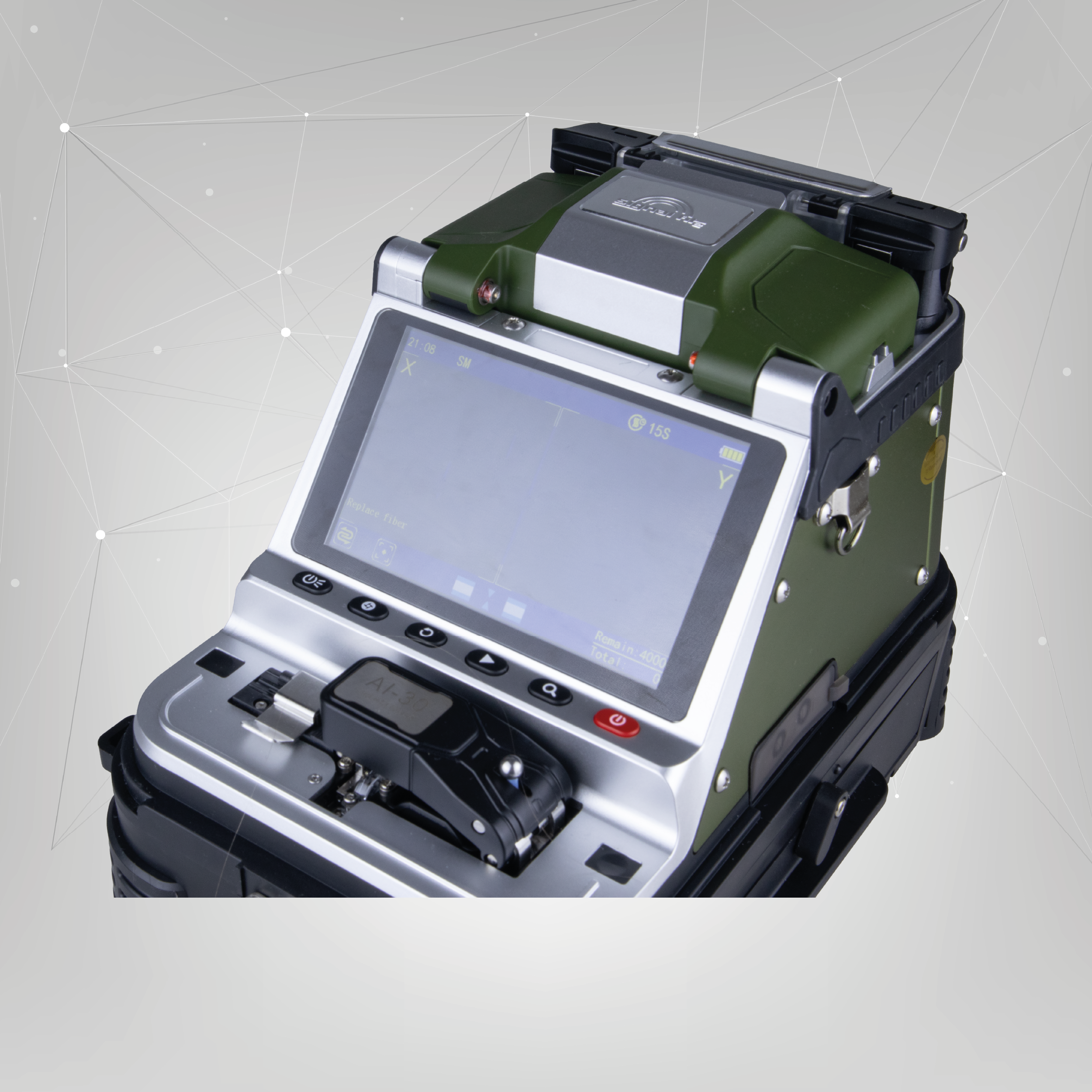 The offered product includes an integrated fiber optic cutter. This allows you to immediately place the fiber into the holder with a short movement after cutting. Additional features include a built-in optical power meter and a visual fault locator. The power meter measures transmitted power over a given segment and supports wavelength measurements of 850, 1300, 1310, 1490, 1550, and 1625 nm. The visual fault locator allows you to inspect fiber damage over a short segment (15 mW power). The set also includes essential accessories: a 7800 mAh battery with charger, extra electrodes, an advanced stripper, a brush, and an alcohol dispenser. Everything is housed in a convenient case, to which you can optionally attach a strap.