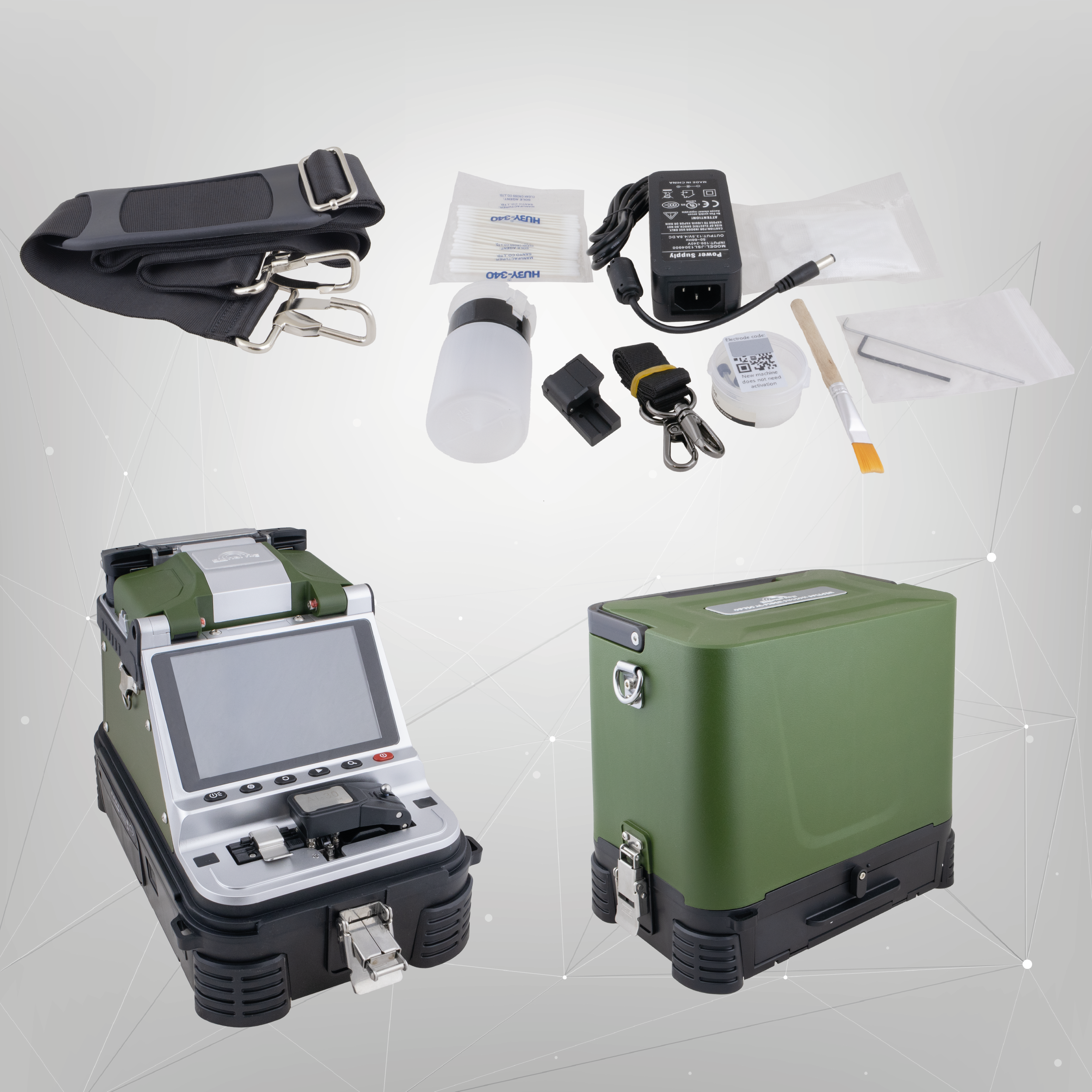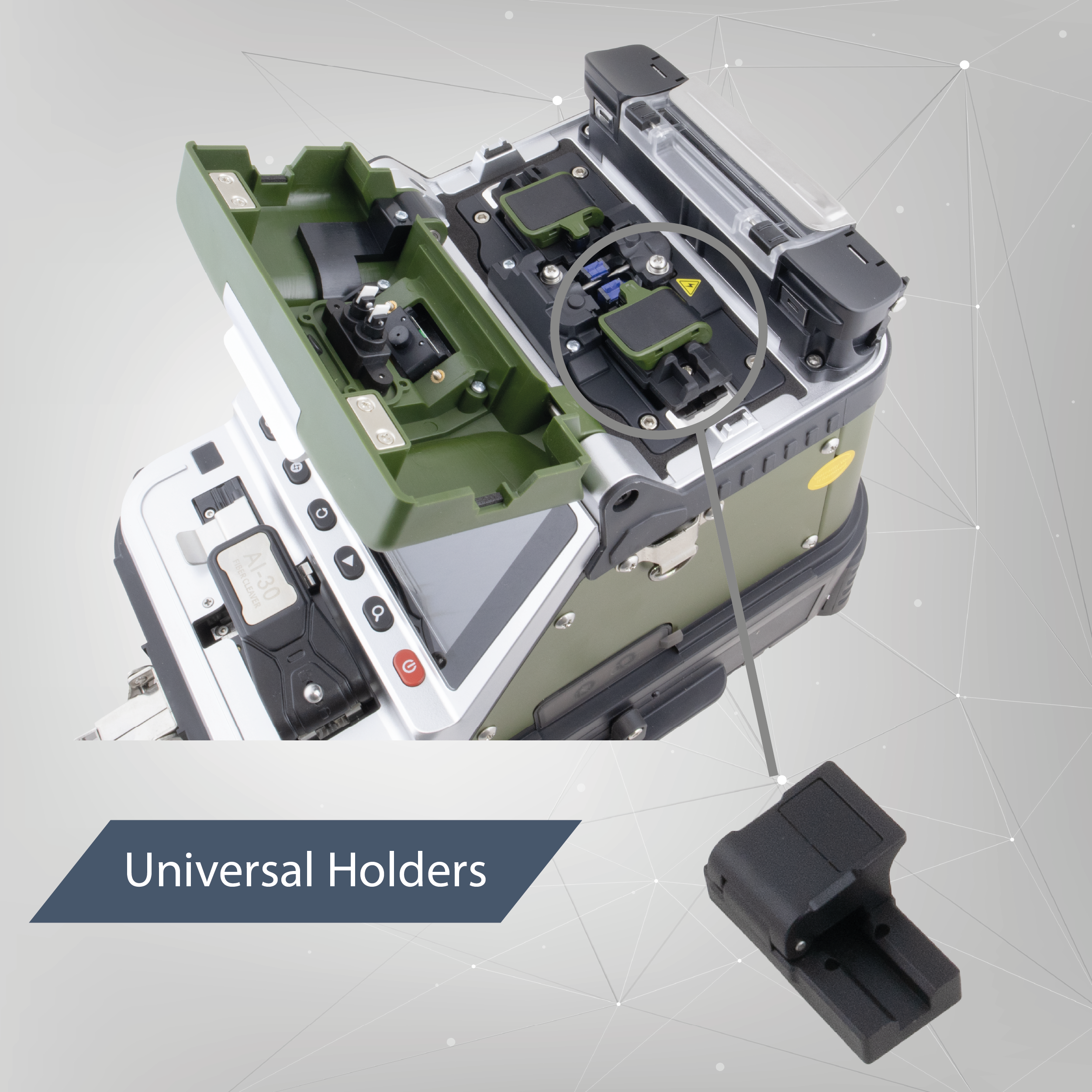 The device comes with universal holders that can be used for splicing bare fibers of various sizes and diameters, pigtails, and drop cables. Additionally, the set includes a holder that allows splicing SOC-type connectors.