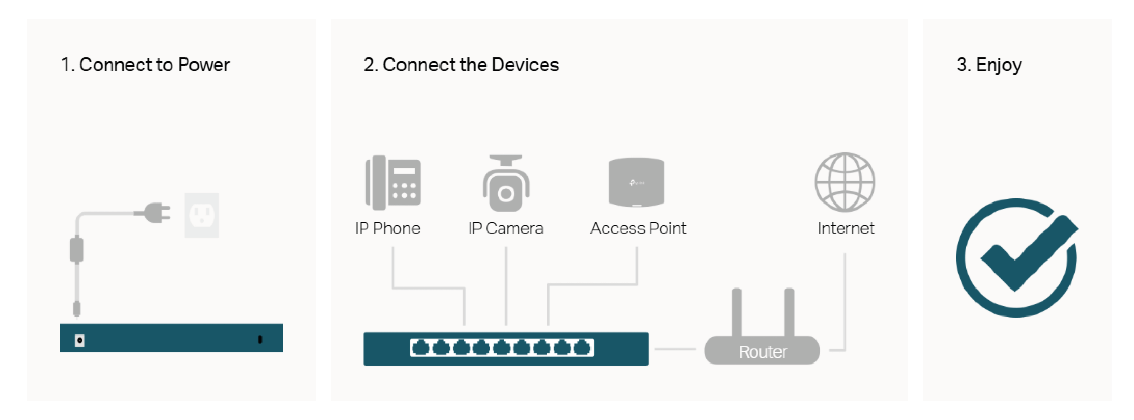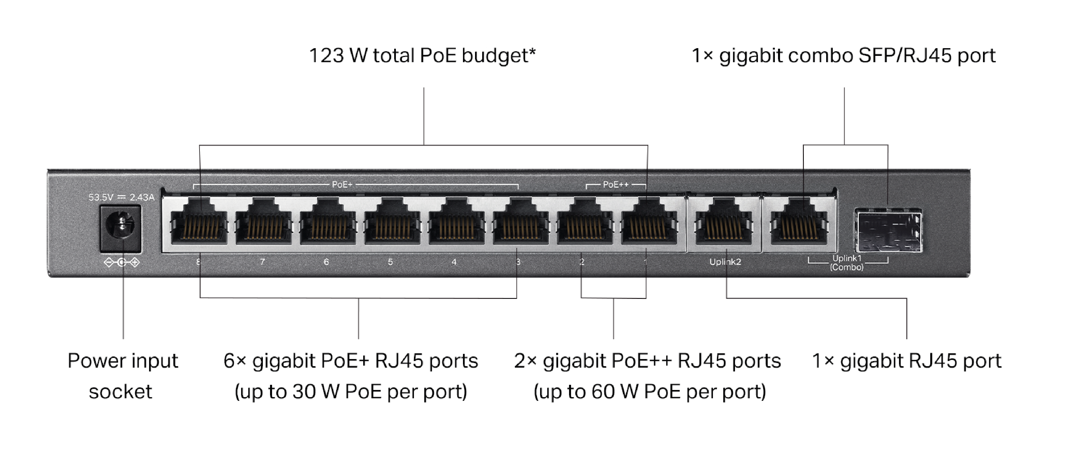 The TL-SG1210PP switch complies with IEEE 802.3af/at/bt PoE standards, offering a total PoE power budget of up to 123W (up to 30W on PoE+ ports and up to 60W on PoE++ ports). When the total power of 123W is exceeded, the intelligent power management function will cut power to lower-priority ports to protect devices from damage.
