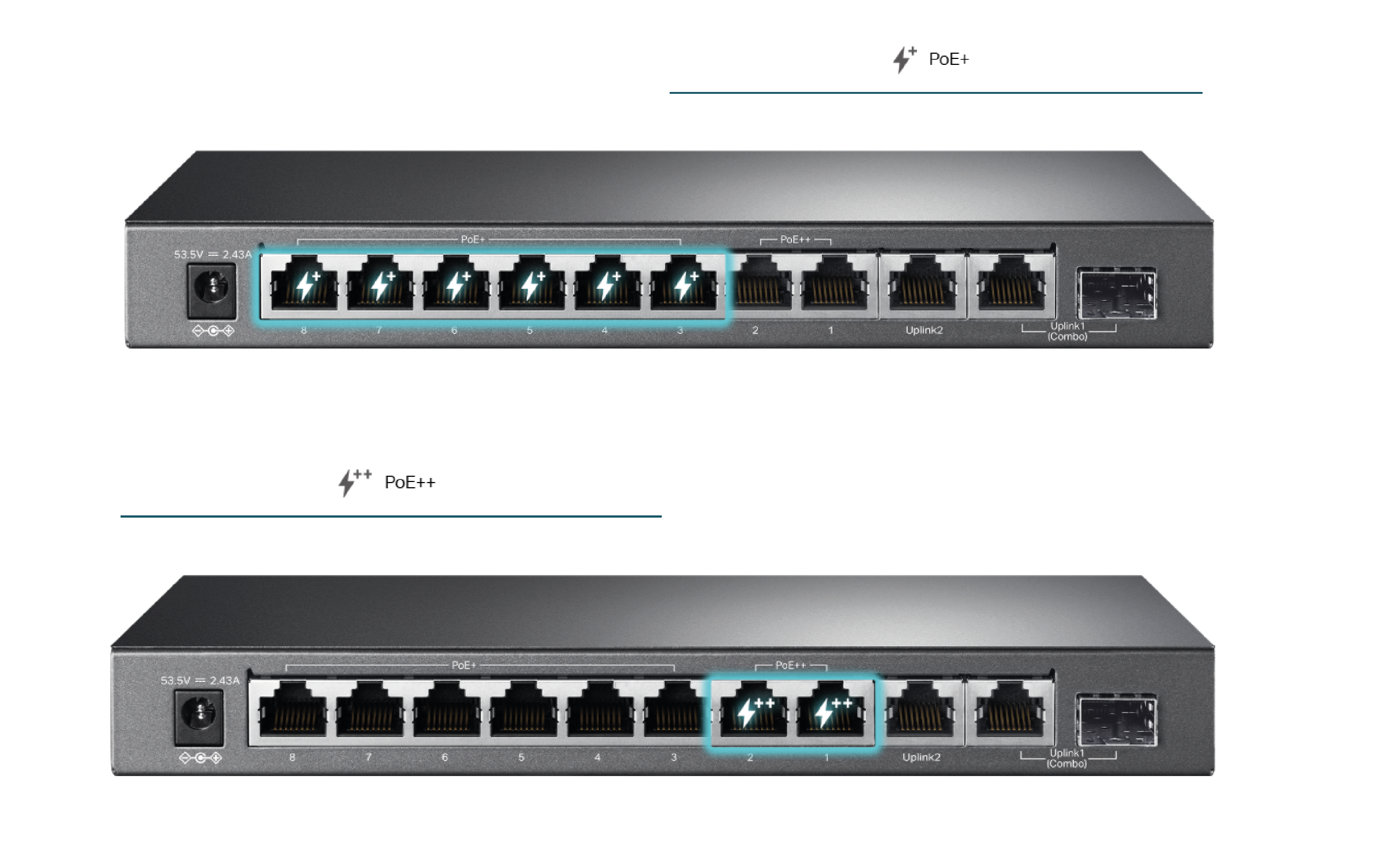 PoE Ports (RJ45)     PoE++ Ports: 1 - 2 (802.3af/at/bt compliant)