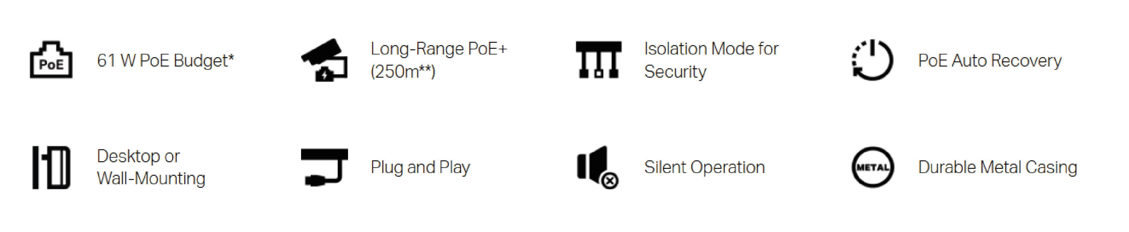 Ports 9× 10/100/1000 Mbps RJ45 Ports (Ports 1–8 with PoE+ output)