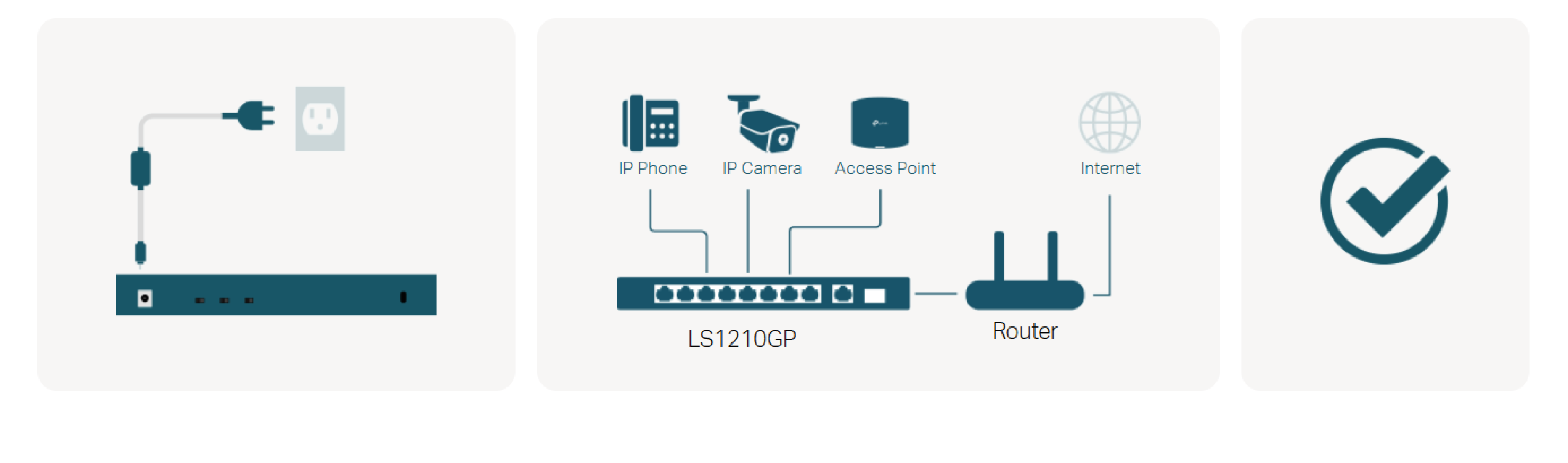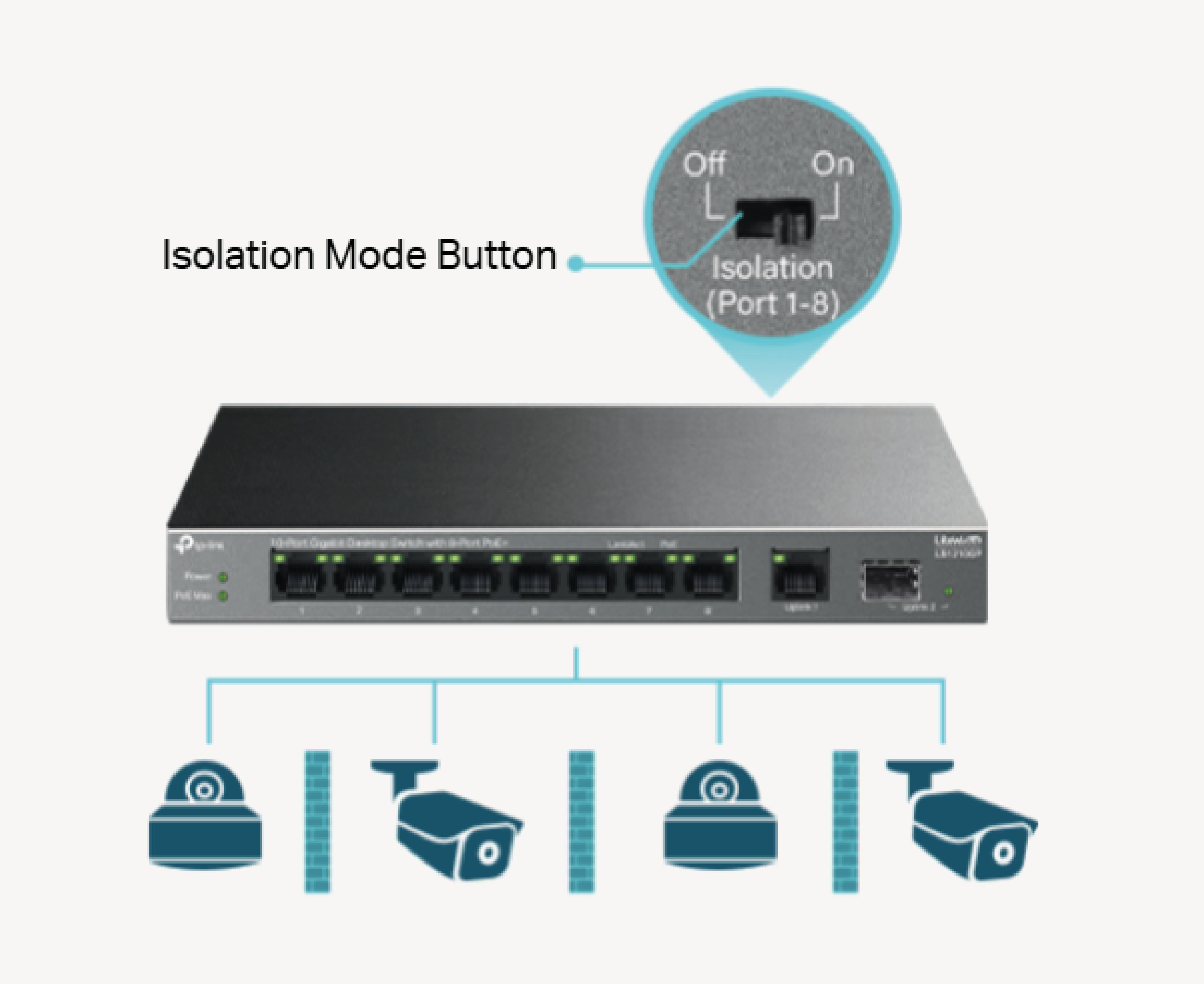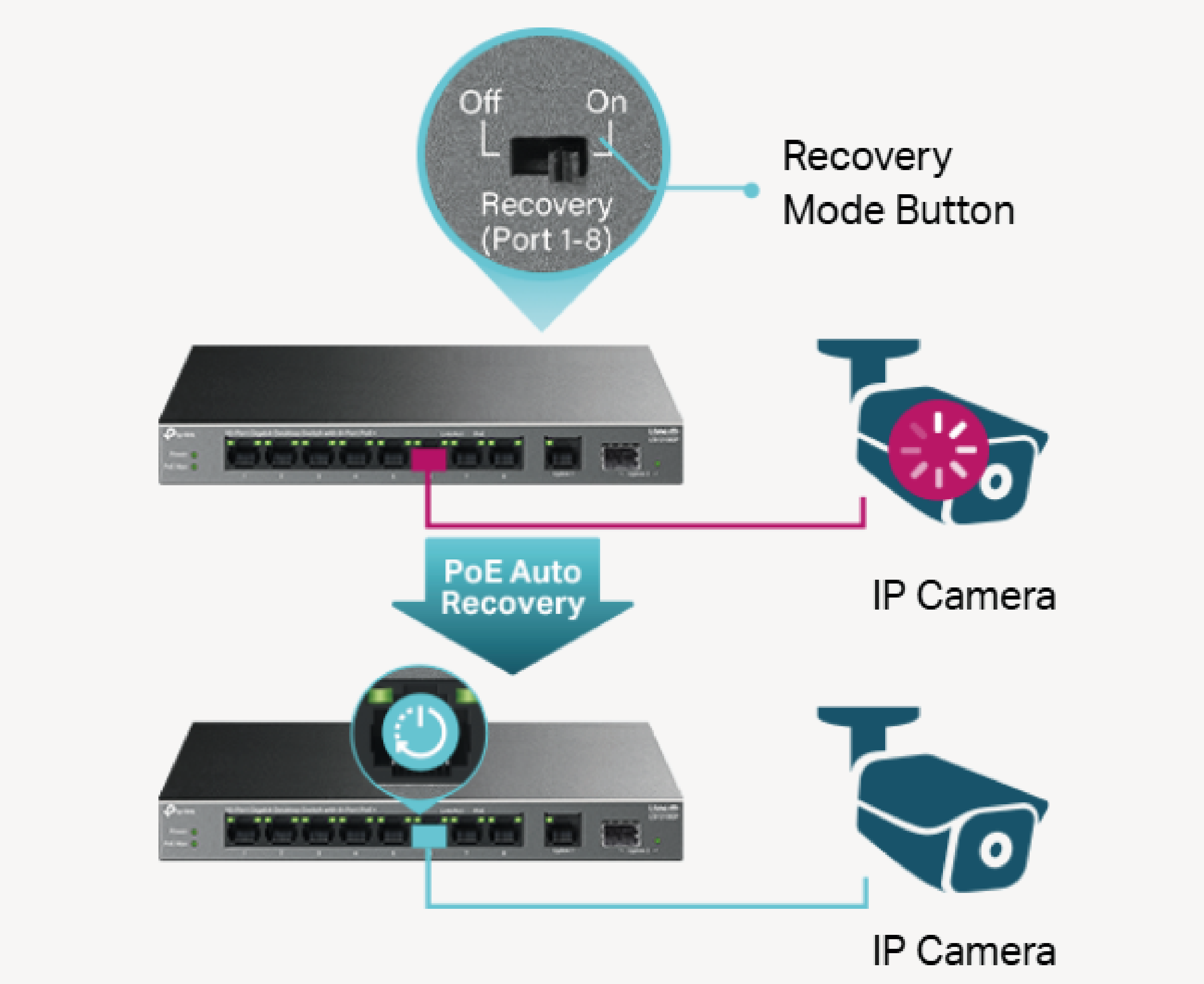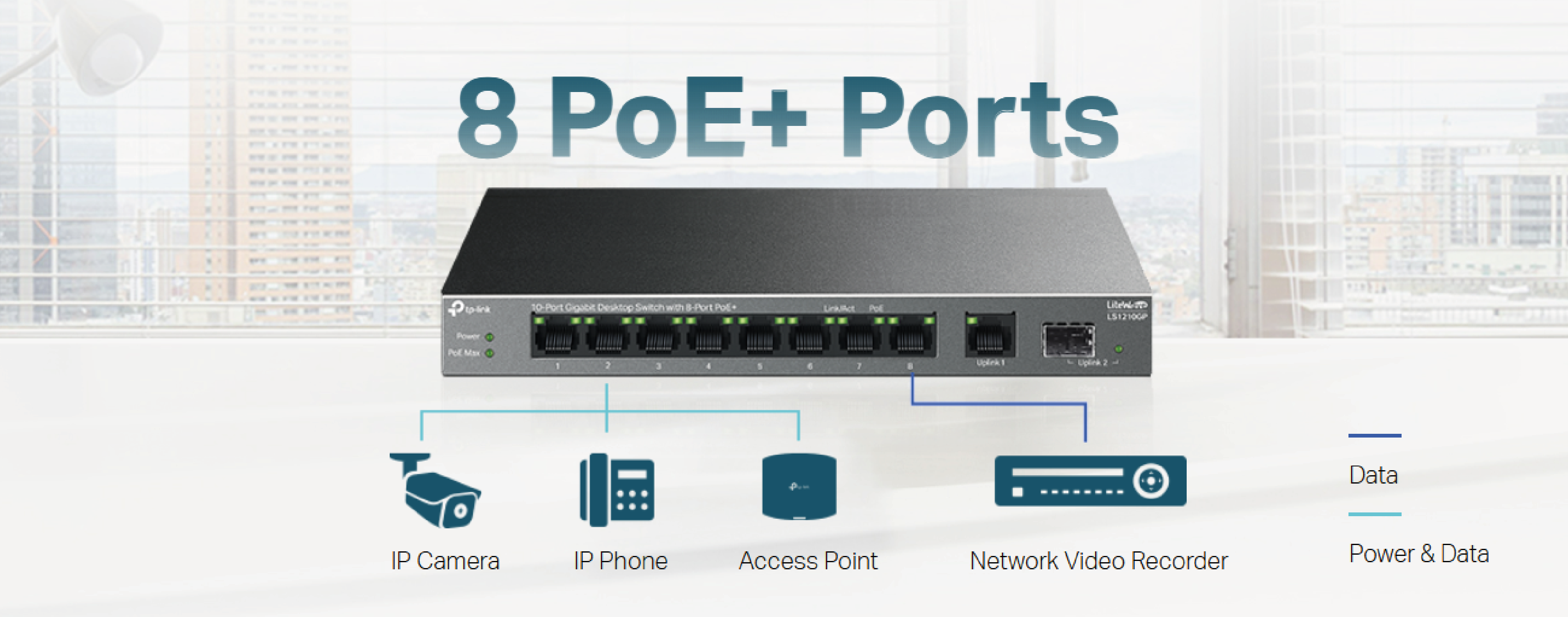 The TL-SG1210PP switch complies with IEEE 802.3af/at/bt PoE standards, offering a total PoE power budget of up to 123W (up to 30W on PoE+ ports and up to 60W on PoE++ ports). When the total power of 123W is exceeded, the intelligent power management function will cut power to lower-priority ports to protect devices from damage.