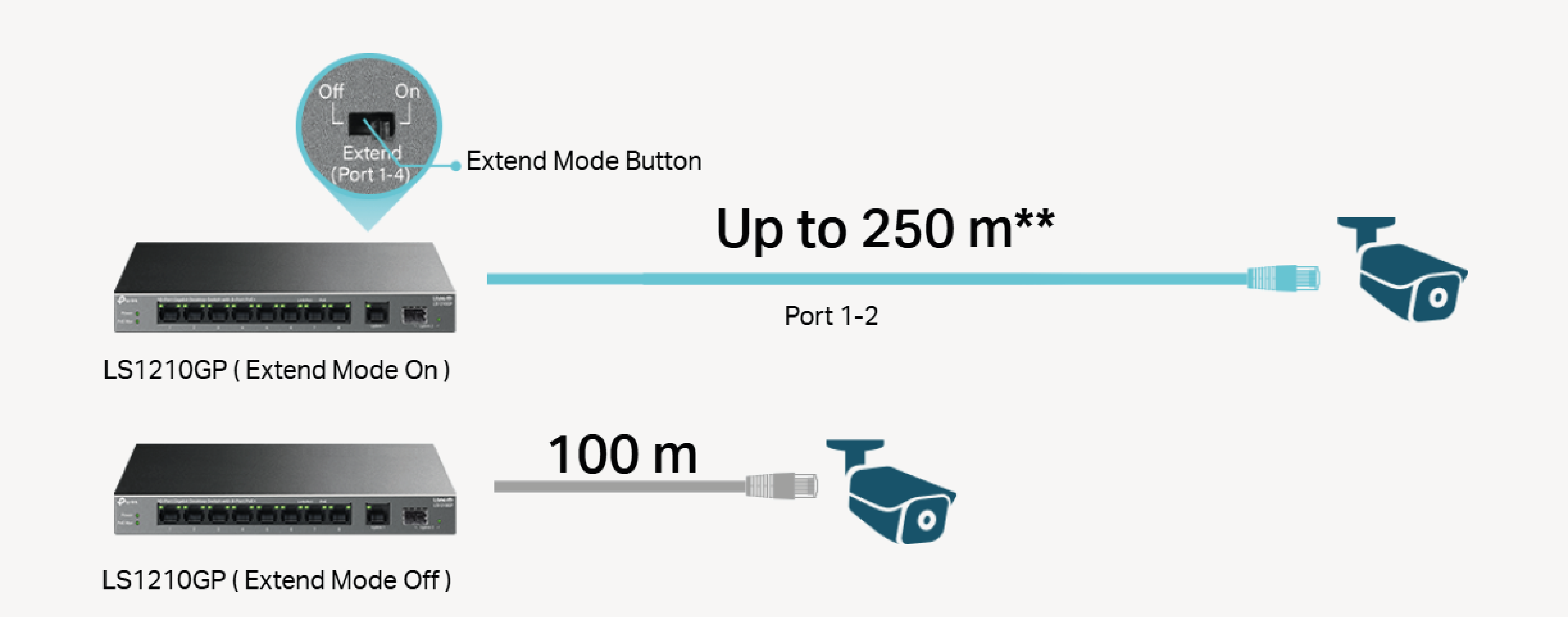 Advanced Features     Extend Mode (Ports 1-4, up to 250m PoE power and data transmission)