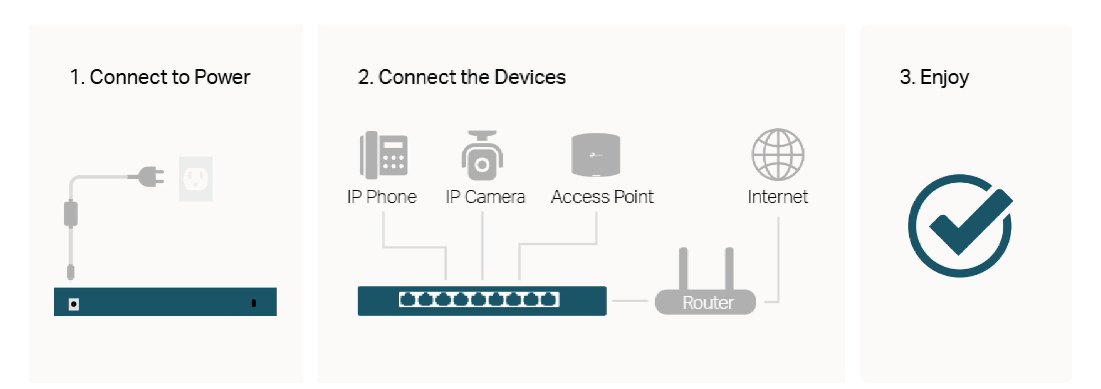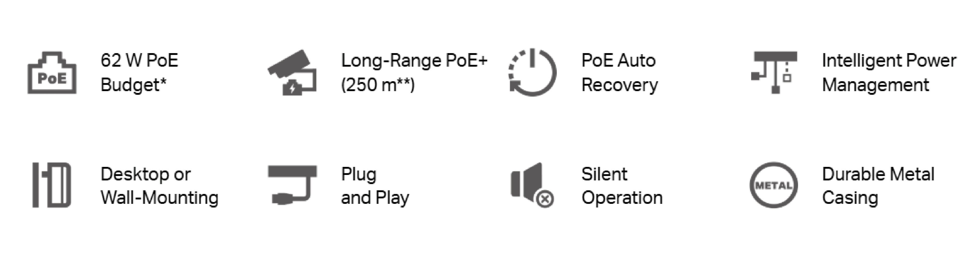 Ports | 8× 10/100/1000 Mbps RJ45 Ports (Ports 1–8 with PoE+ 802.3af/at output) Auto Negotiation Auto MDI/MDIX |
