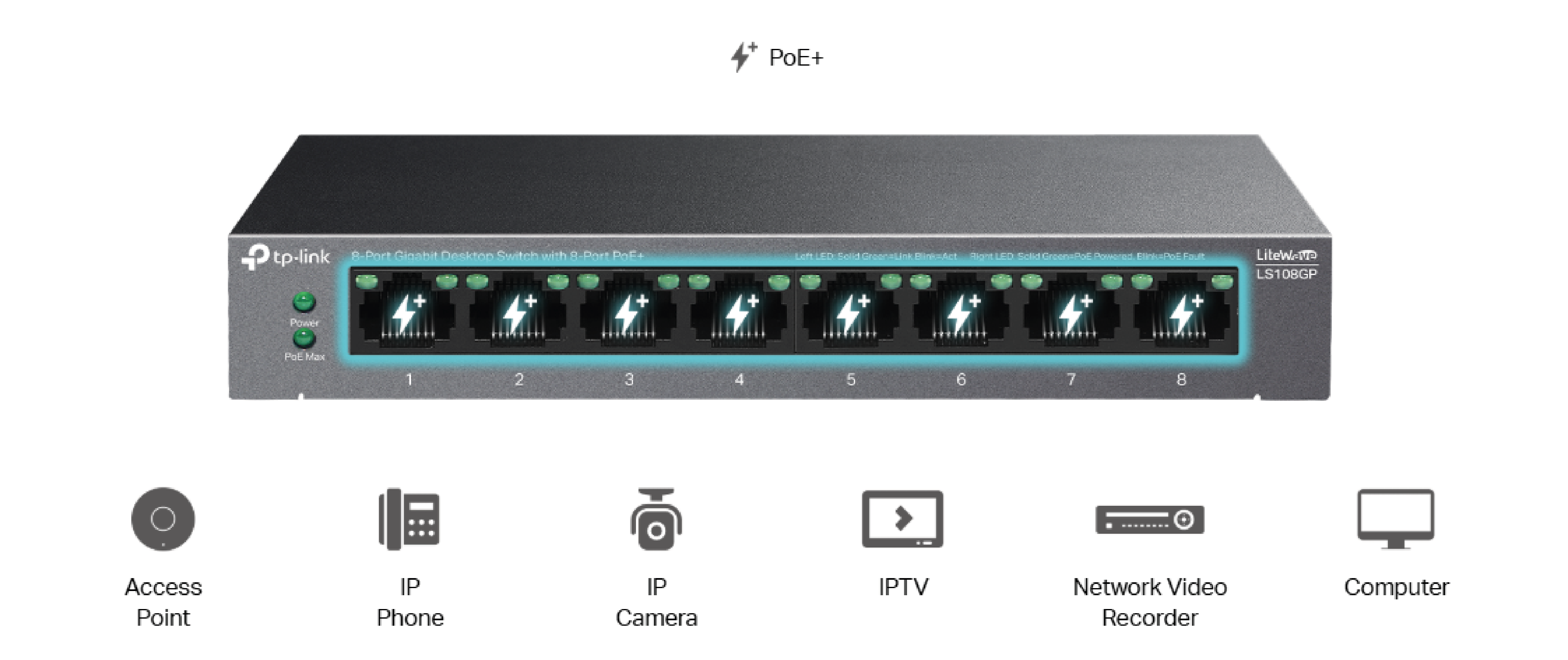 The LS108GP switch complies with IEEE 802.3af/at PoE standards, offering a total PoE power budget of up to 62 W (up to 30W on each PoE port*). When the total power of 62W is exceeded, the intelligent power management function will cut power to lower-priority ports to protect devices from damage.