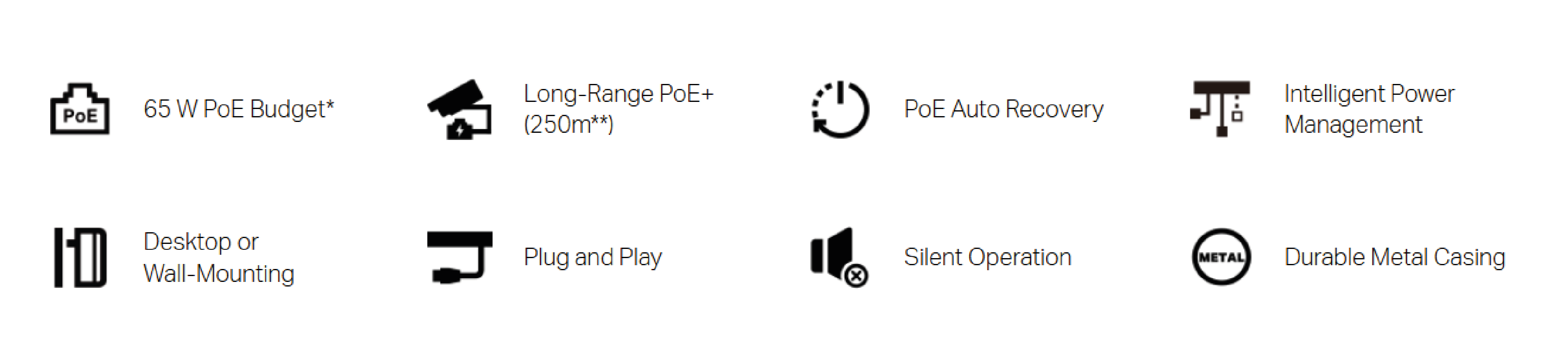 Advanced Features | Extend Mode (Ports 1-2, up to 250m PoE power and data transmission) PoE Auto Recovery (Ports 1-4) 802.3af/at PoE Device Compliance Automatic MAC Address Learning and Aging IEEE 802.3x Flow Control 802.1p/DSCP QoS IGMP Snooping Green Technology |