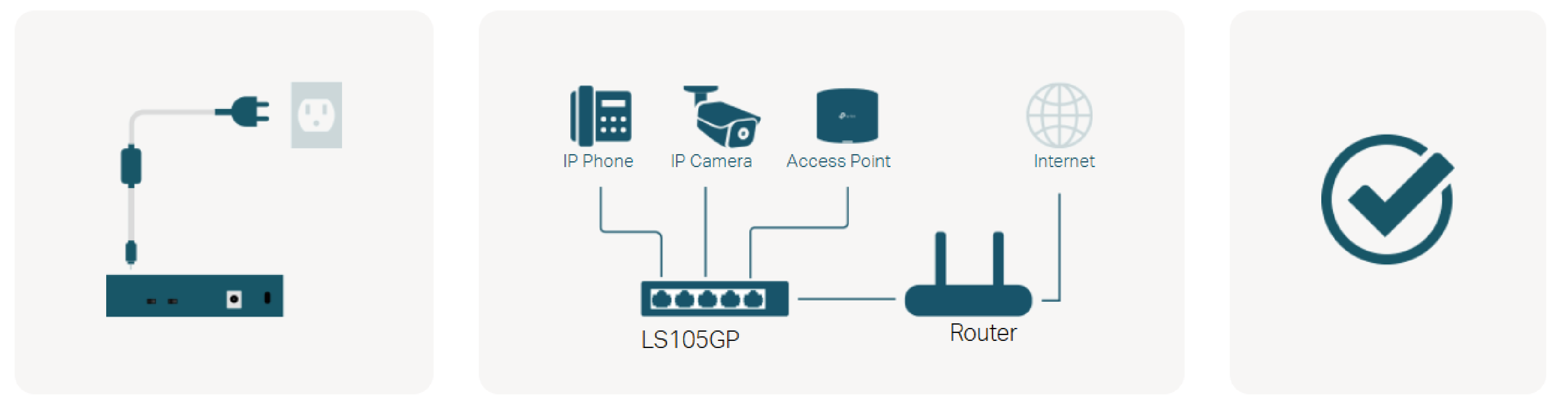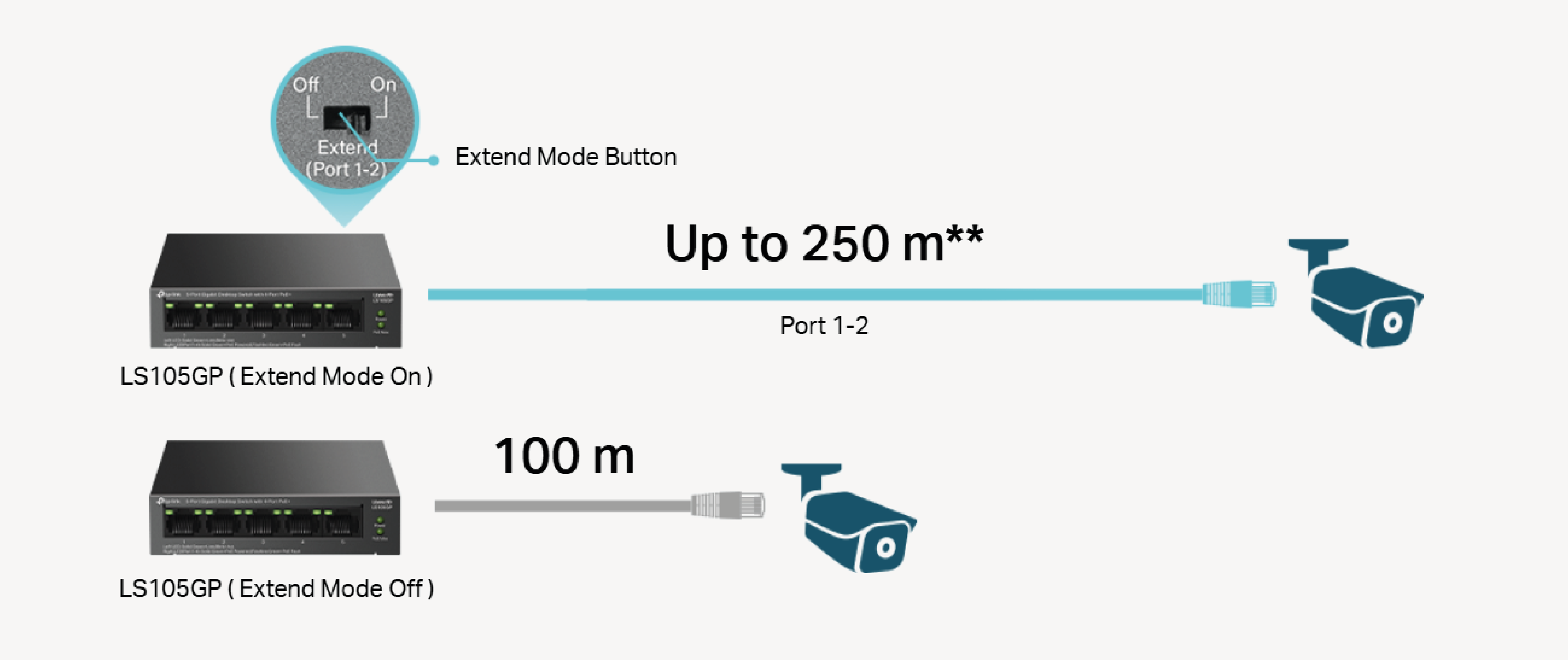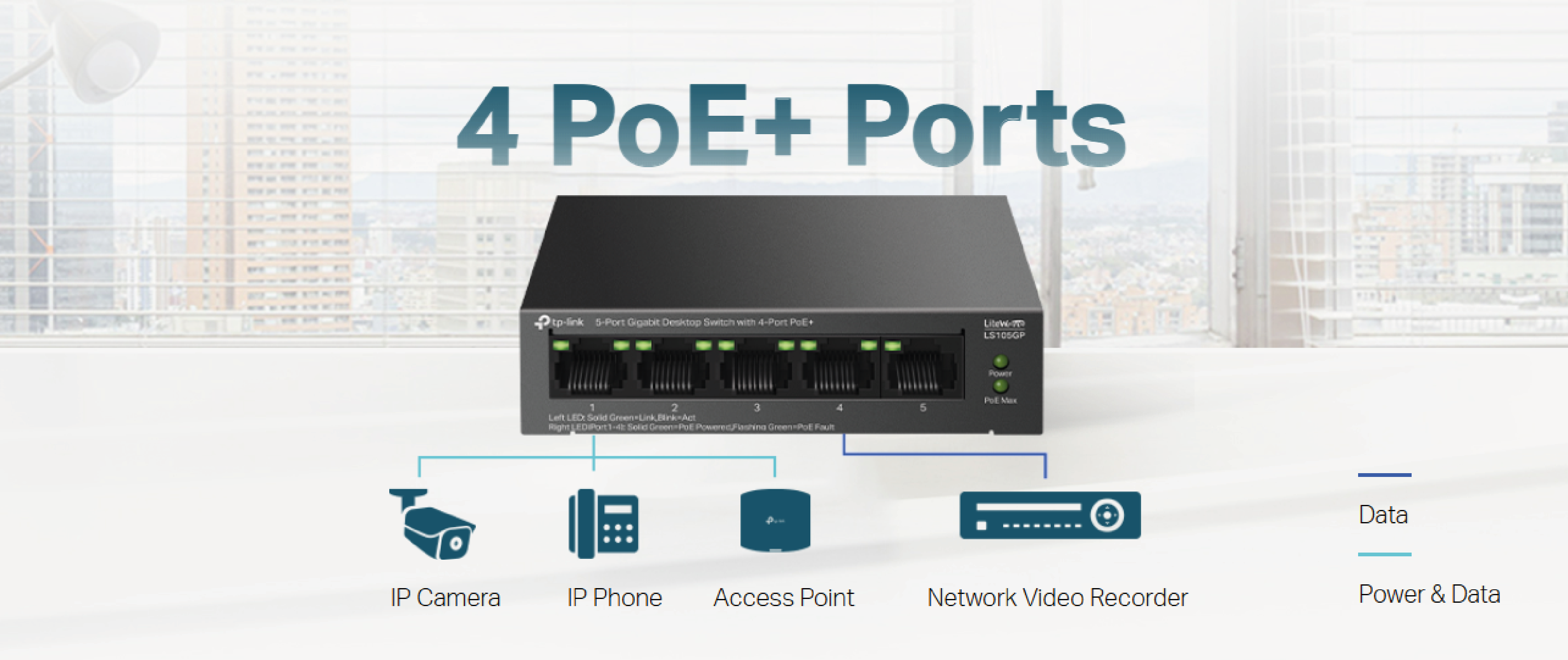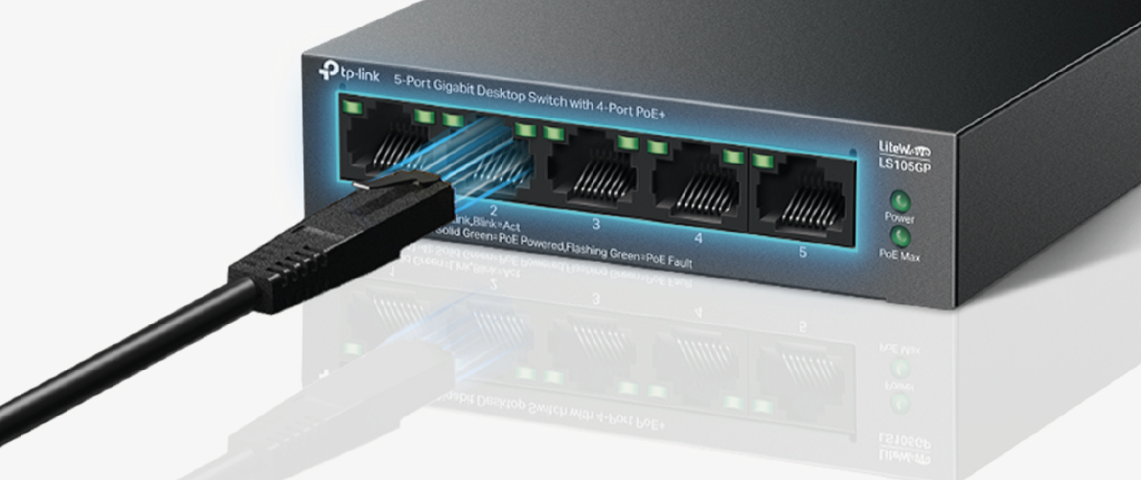 The TP-Link LS105GP is an unmanaged desktop switch equipped with a total of 5 Gigabit Ethernet ports (10/100/1000 Mbps), ensuring fast and stable connectivity for all connected devices on the local network. Of these ports, 4 Ethernet ports (Ports 1–4) support power over the PoE+ (802.3af/at) standard, with a maximum power output of up to 30 W per port, enabling power supply for end devices such as Wi-Fi access points or IP cameras. The total PoE power budget for the entire device is 64 W. The LS105GP operates in Plug and Play mode and requires no configuration or software management, but it offers two operating modes switchable via a physical slider: the "Extend" mode increases the PoE power and data transmission range on ports 1-4 to 250 meters, at the cost of limiting bandwidth to 10 Mbps, while the "Priority" mode ensures power priority to the highest-numbered ports to protect against overloading the total PoE budget in case too many power-hungry devices are connected. The device features a metal desktop enclosure and is equipped with passive cooling (fanless), guaranteeing silent operation; the switch can be placed on a desk or shelf or mounted on the wall using the included kit.