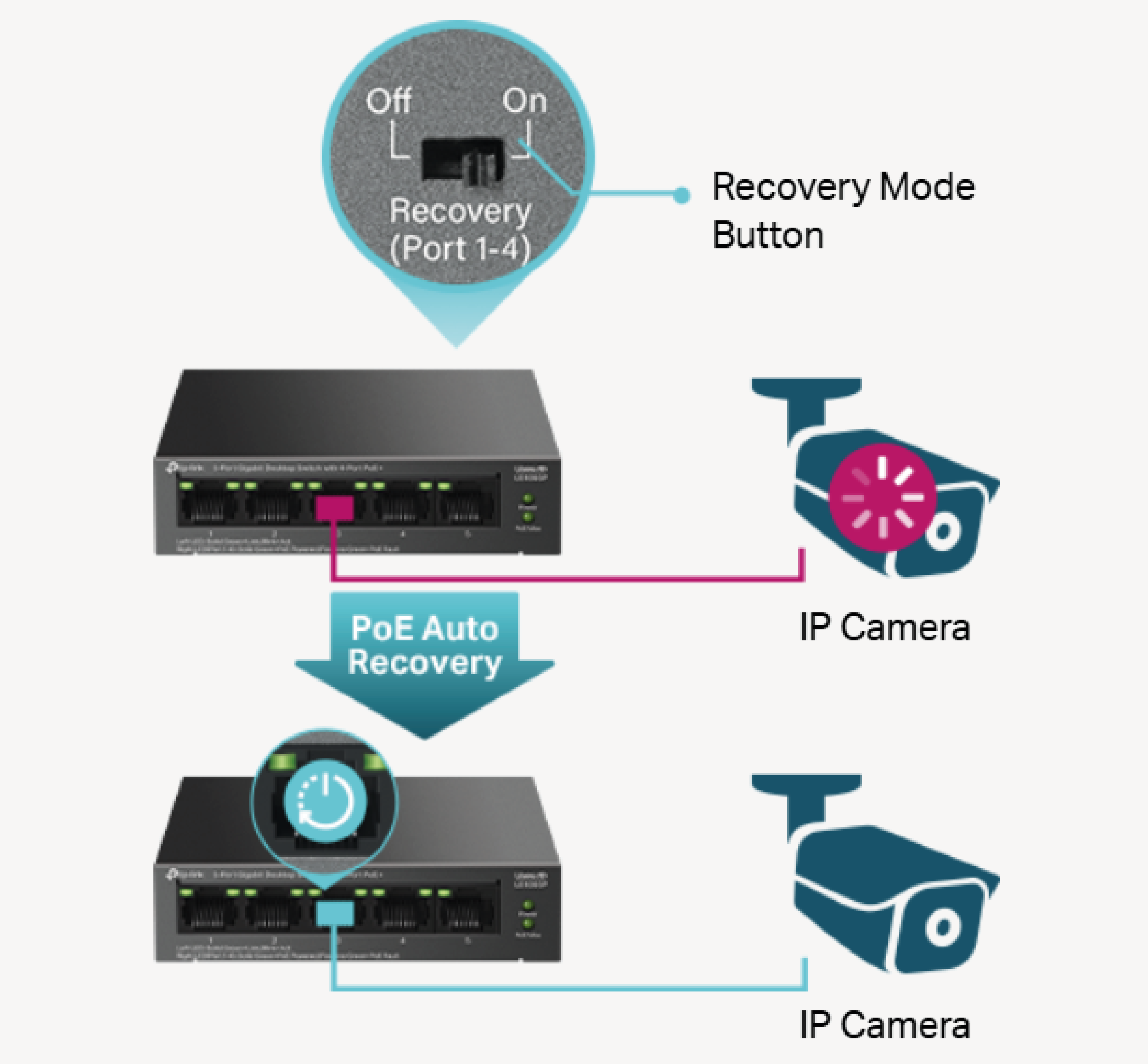 Ports | 5× 10/100/1000 Mbps RJ45 Ports (Ports 1–4 with PoE+ 802.3af/at output) Auto Negotiation Auto MDI/MDIX |