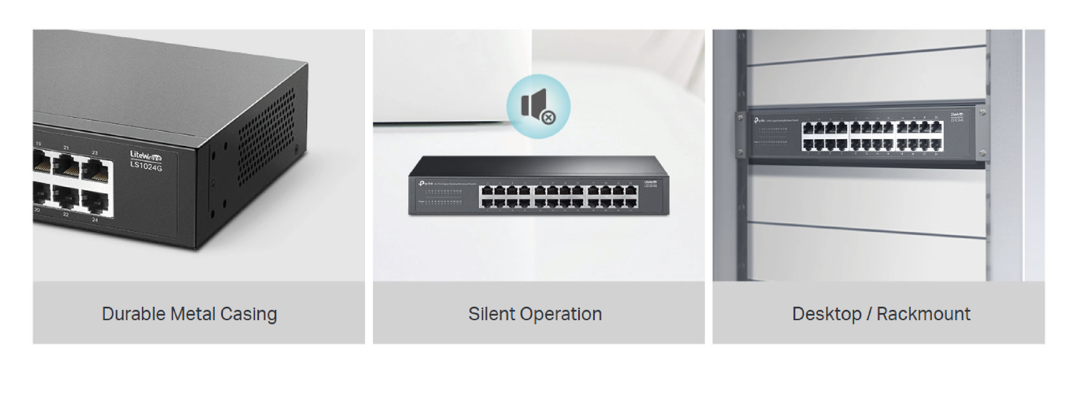 LS1024G’s durable metal case allows for efficient heat dissipation, excellent signal interference prevention, reliable equipment stability, and a long network life. Its fanless design reduces power consumption and noise generated, making it ideal for noise-sensitive environments. And you can put the switch on desk or mount it to the rack according to your demand.