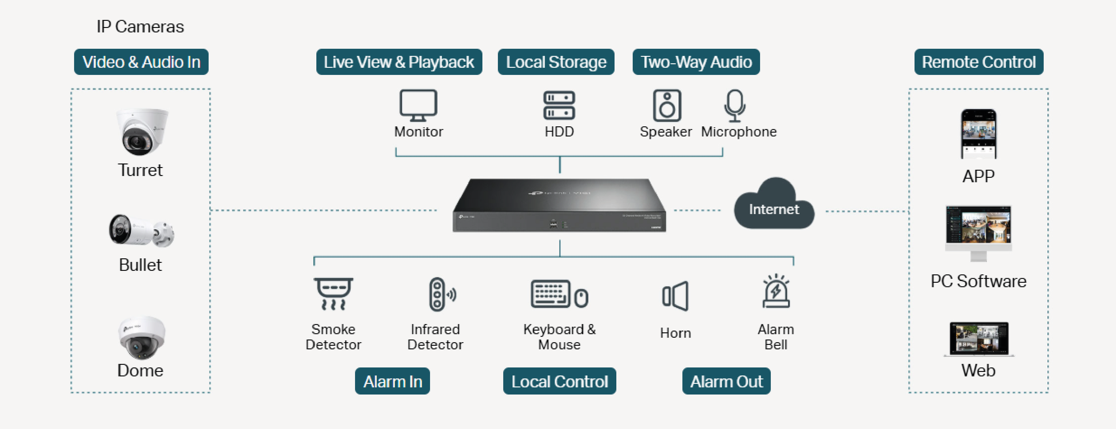 A key advantage is the support for H.265+ – a modern, efficient data encoding that reduces the size of recorded footage and bitrate. The recorder supports the ONVIF standard and can also be used with cameras from other manufacturers. The total supported bandwidth is 320 Mbps, which ensures efficient handling of 16 high-resolution cameras. The recorder is managed via the TP-Link VIGI software, available on PC or mobile devices.