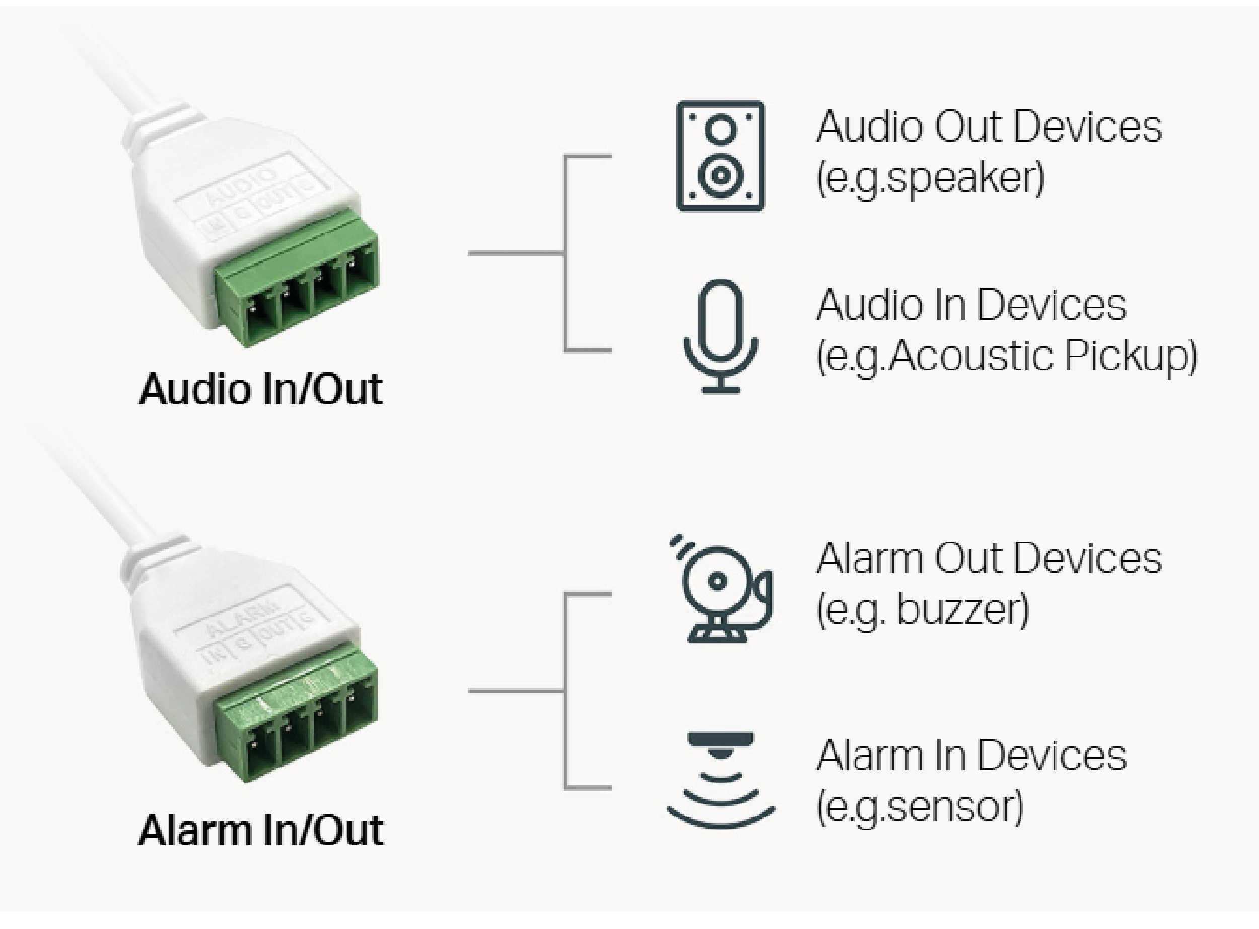 Audio and alarm input/output ports allow for easy integration with external alarms.