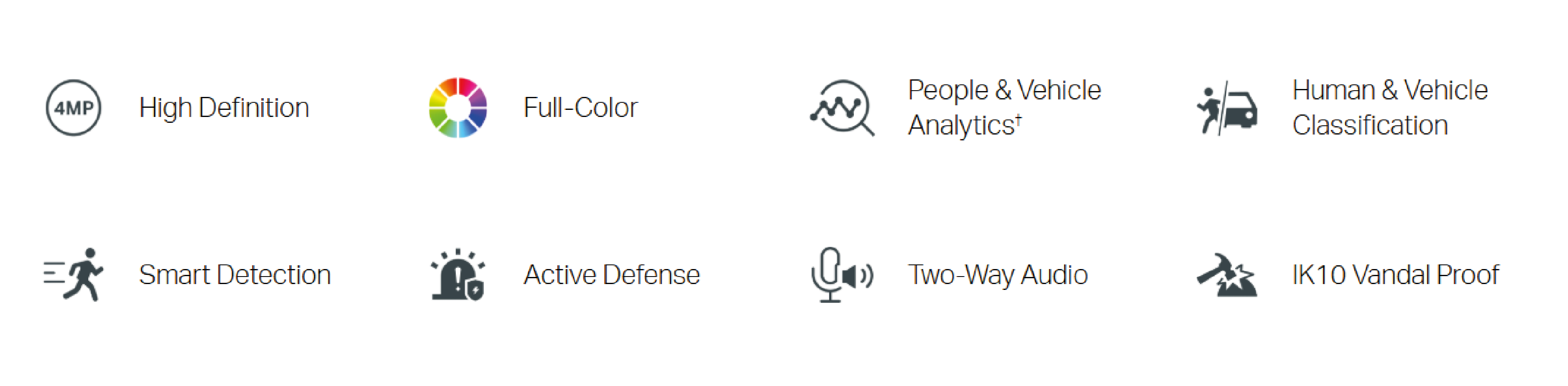 Basic Events | Motion Detection (aided by People and Vehicle Classification for more accurate alerts) Camera Tampering Detection Exception (Illegal Login) |