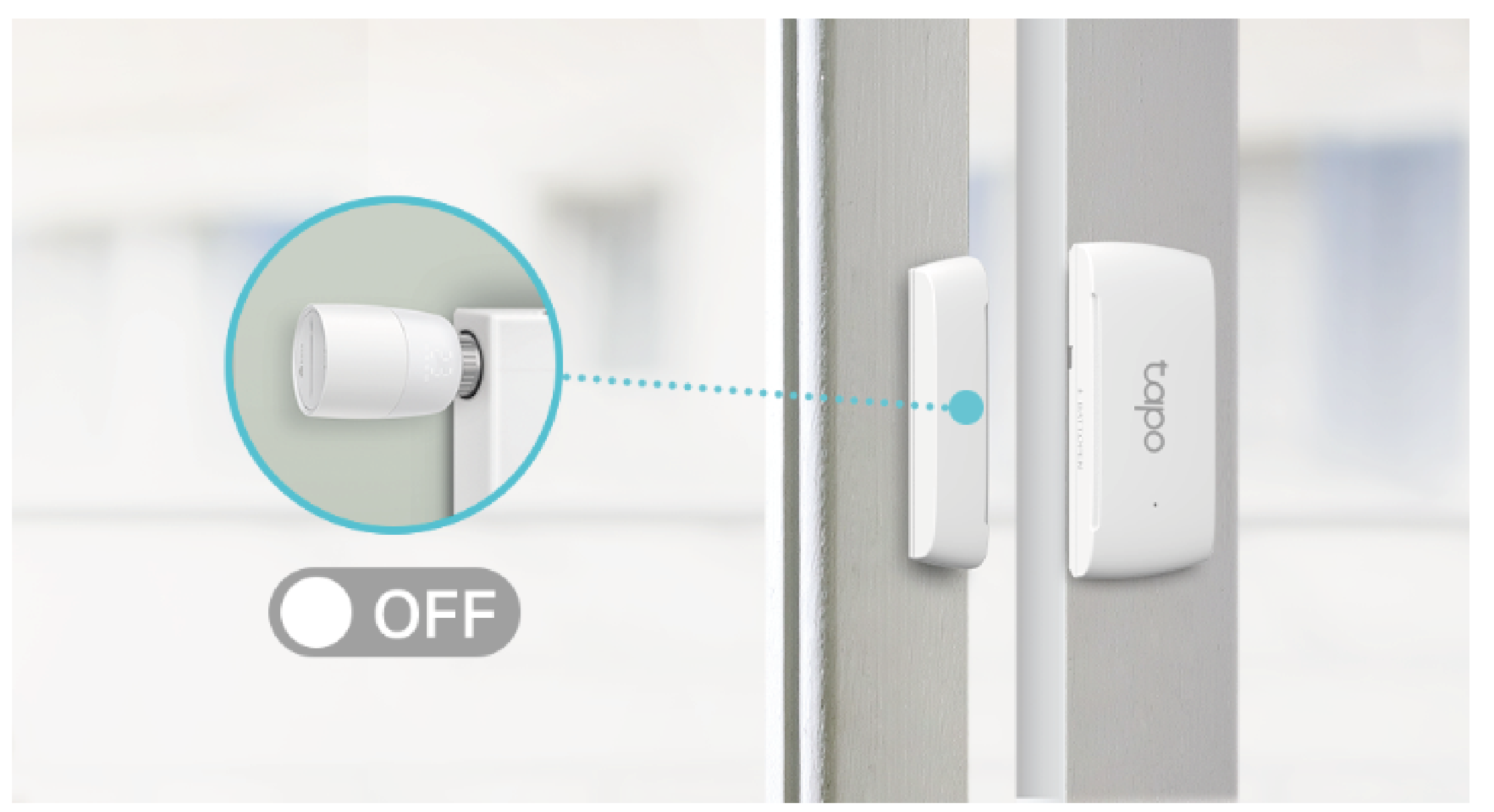 The thermostat automatically turns off heating and activates Frost Protection when a connected magnetic sensor (Tapo T110) is triggered. This solution saves energy and maintains home safety.