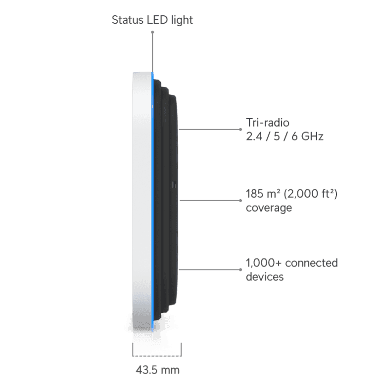The access point is designed to operate under the control of the UniFi system; it requires an appropriate controller and does not have a stand-alone mode. It can broadcast a Wi-Fi 7 wireless network across three bands, supporting the IEEE 802.11 b/g/n/ax/be protocols on 2.4 GHz, IEEE 802.11 a/n/ac/ax/be on 5 GHz, and IEEE 802.11 ax/be on 6 GHz. The maximum theoretical throughput is 688 Mbps on 2.4 GHz, 8.6 Gbps on 5 GHz, and 11.5 Gbps on 6 GHz.