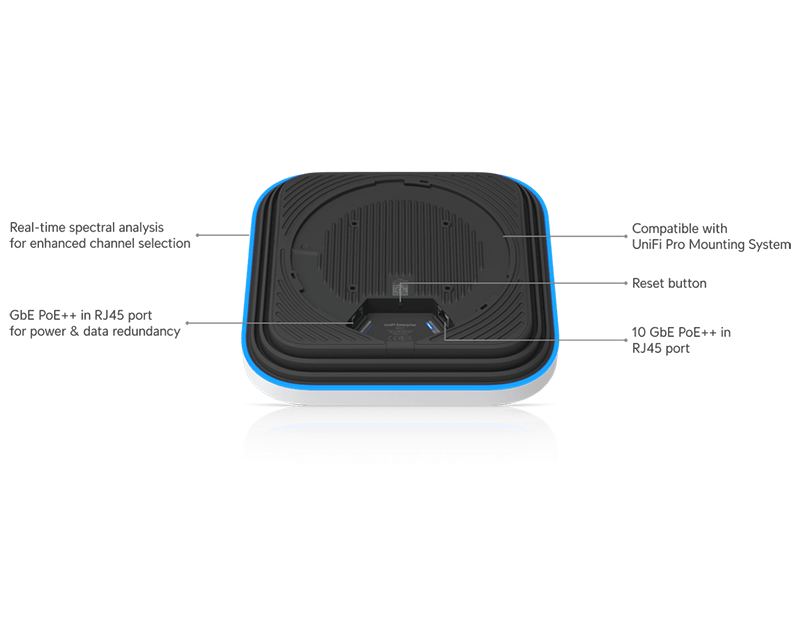The access point belongs to the Enterprise product line, which stands out for higher performance compared to standard UniFi solutions. Thanks to the use of up to 10 MIMO streams and three operating bands, it can achieve very high throughput and handle many users simultaneously (up to 1000). The inclusion of two ports allows you to configure the entire network in failover mode — with proper setup, you can protect against failures of switches, gateways, or controllers.
