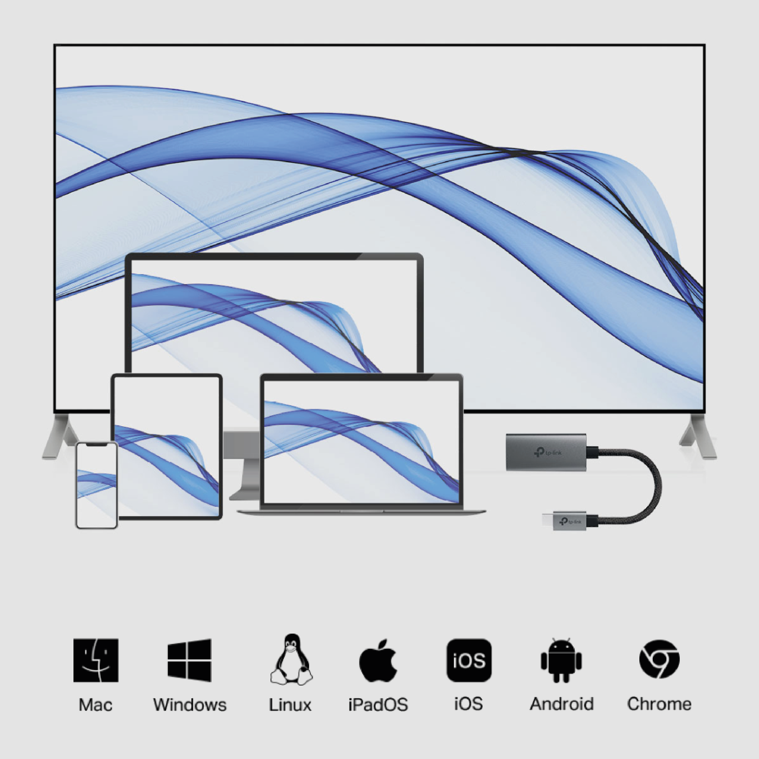 TP-Link UA520C is a USB Type-C to HDMI adapter, converting the video signal from a USB-C port (DP Alt Mode required) to HDMI. It allows image transmission up to 4K@60Hz resolution. It operates in Plug & Play mode and is compatible with Windows, macOS, Android, iOS, and Linux systems. It features a durable, aluminum casing and a short, flexible braided cable, ensuring portability and durability.