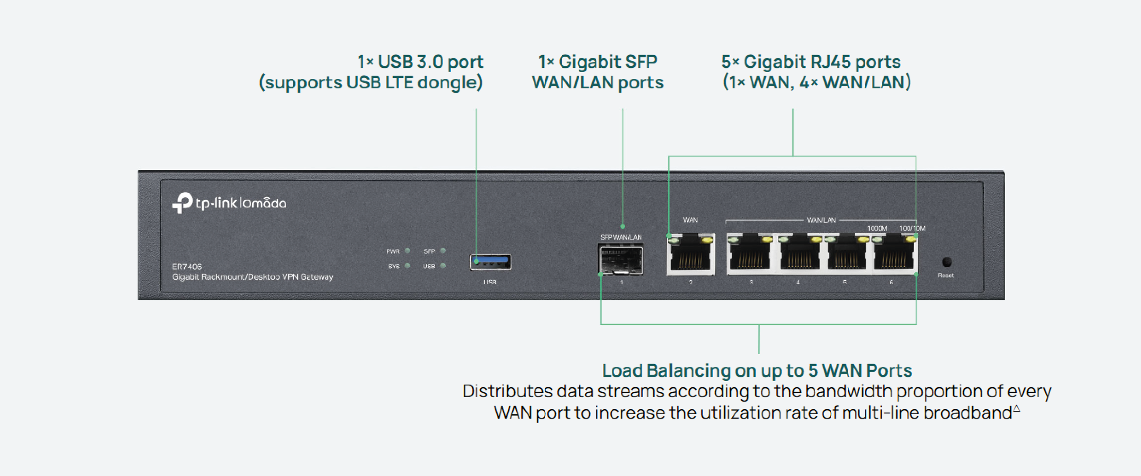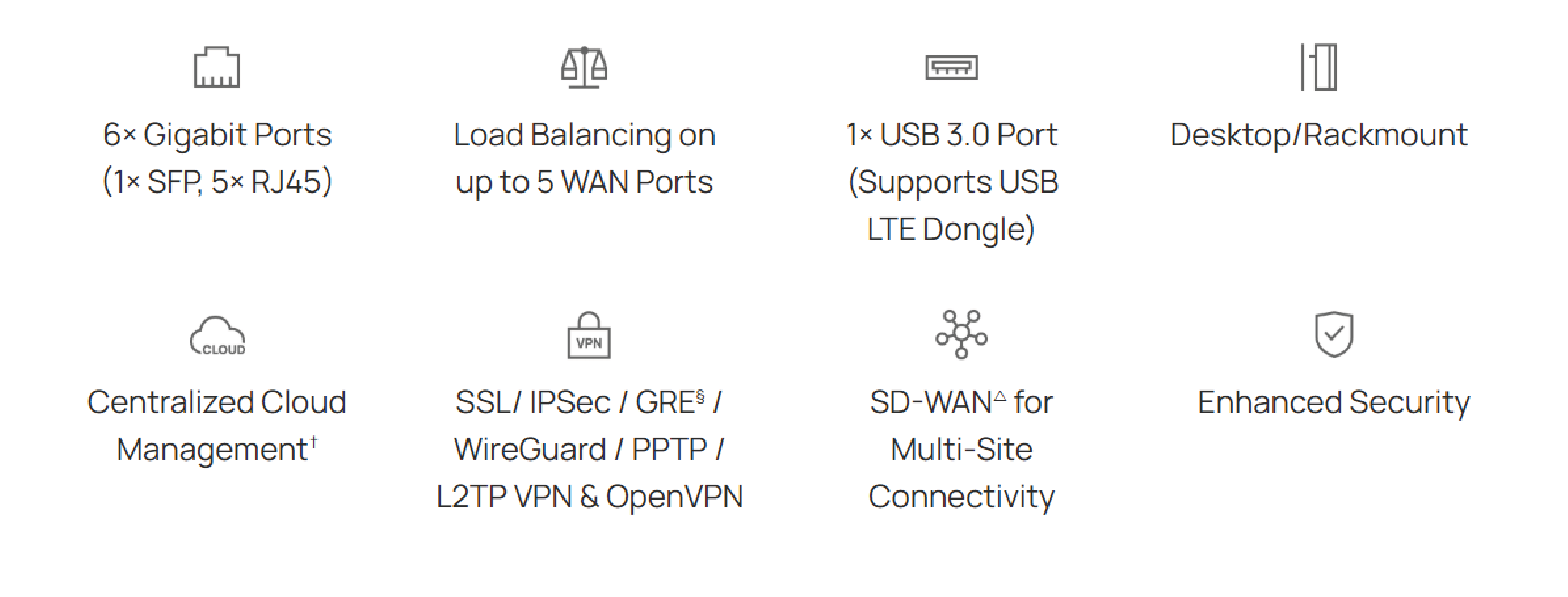 | Ports | 1 Gigabit SFP WAN/LAN slot 1 Gigabit WAN port 4 Gigabit LAN/WAN ports 1 USB 3.0 Port (supporting USB Storage and USB LTE Modems) |