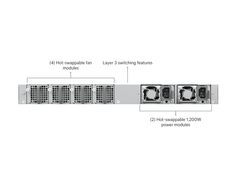 The device is designed for uninterrupted operation. It has 2 power supplies that can operate in Redundant mode – if one fails, the other takes over. The switch also features 4 hot-swappable fan modules, operating in 3+1 redundant mode. All of these modules can be purchased separately and replaced without powering down the switch.
