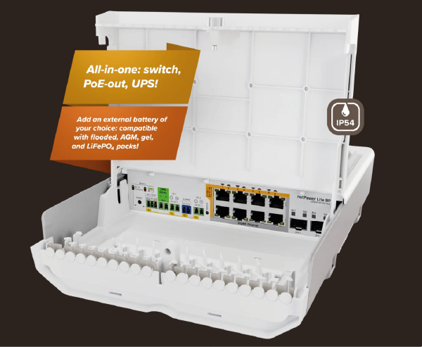 MikroTik netPower Lite 8P is a switch equipped with 8 Gigabit Ethernet ports (10/100/1000 Mbps) and 2 SFP+ slots (10 Gbps). Each Ethernet port provides PoE+ power output (802.3af/at), with a maximum power budget of 30 W per port and 120 W for the entire device (the total budget depends on the power supply used; the power supply must be purchased separately). The switch features an outdoor-ready enclosure with an IP55 protection rating. The set includes a bracket that allows you to mount the device on a pole. The most important advantage of the netPower Lite 8P is its integrated UPS functionality — you can connect external batteries to the switch (24 V DC input voltage). An external temperature sensor can also be connected, and the alarm port enables simple (2-wire) operating-status reporting. The charging current ranges from 0.2 to 1.6 A, and the voltage from 20 to 31.7 V. The product comes with the SwOS system, which provides Layer 2 management capabilities.