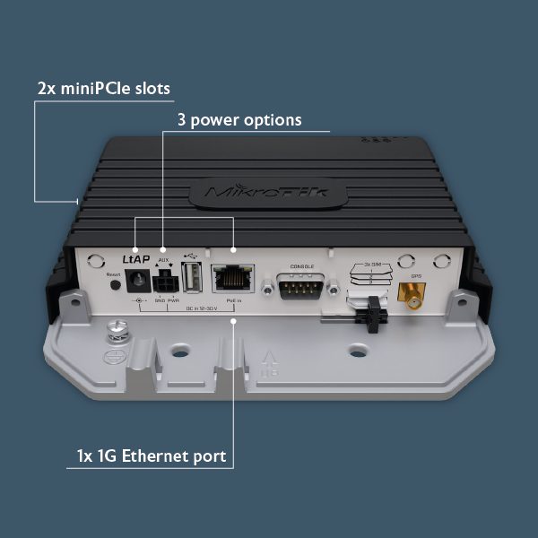 The router is equipped with one 1G Ethernet port (10/100/1000 Mbps), which also serves as a PoE input (passive PoE 12–30 V DC). Power can also be supplied via a standard DC socket or an automotive connector. Inside the enclosure, there are two miniPCIe slots — one of them already houses the LTE modem, while the second can be used to install an additional modem or radio card as needed.