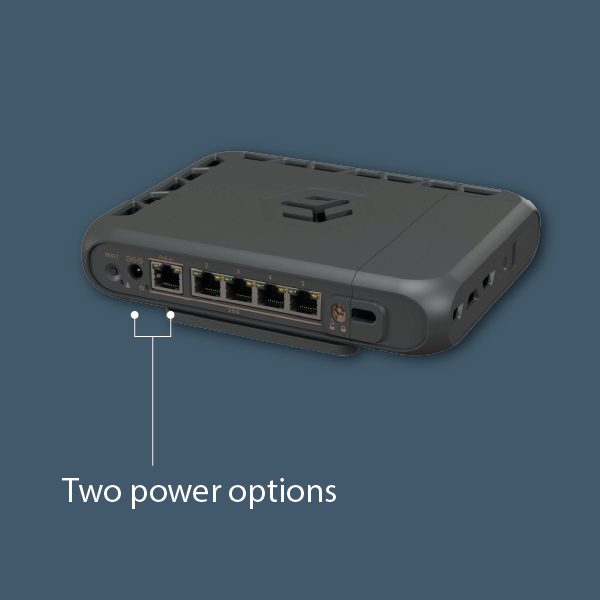 The router features a desktop-style enclosure, and the package includes a stand that allows you to position the device vertically. Power can be supplied via the DC jack (24–57 V DC) or the PoE input (passive PoE / 802.3af/at, 24–57 V DC). The package includes a standard 24 V / 1.5 A power adapter. The maximum power consumption of the device itself is 20 W, with a total maximum power consumption of 29 W.
