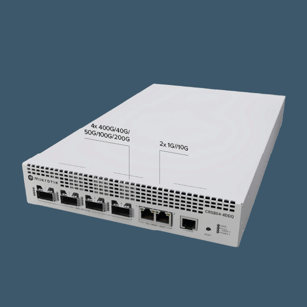 MikroTik CRS804 DDQ is a high-performance switch equipped with 4 × QSFP56-DD slots with up to 400 Gb/s throughput and 2 × 10G Ethernet ports (1 / 2.5 / 5 / 10G). It comes with the RouterOS operating system preinstalled with a Level 6 license, providing advanced Layer 3 management features. The manufacturer has equipped it with a powerful quad-core AL52400 processor clocked at 2000 MHz and 4 GB of RAM. It stands out in terms of capabilities and performance compared to competing switches. The offered product is ideal for a wide range of applications requiring maximum speed. It can be successfully used in a server room to connect critical devices and is an excellent solution for data centers and AI clusters. The package includes two AC hot-swap power supplies designed for redundant operation—if one fails, the other takes over. The ventilation modules are also hot-swap, allowing replacement without interrupting the operation of the device. The package also includes an RMK-2x10/19 rack mount, enabling you to install two switches in a single 19" rack location. The CRS804 DDQ can also be mounted individually in a 19" rack.