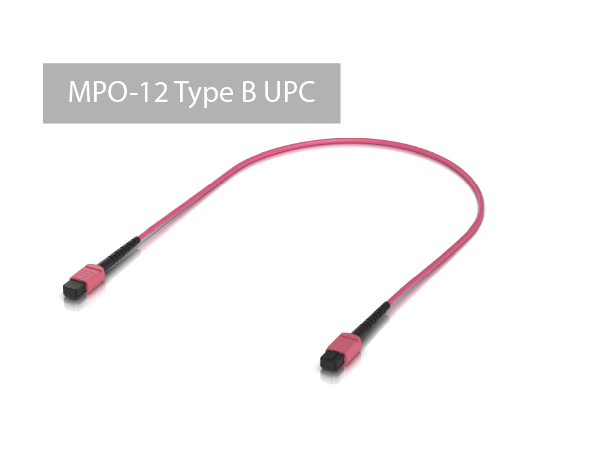 The offered product is a duplex fiber optic patch cord terminated on both ends with MPO-12 Type B UPC connectors. This is a standard widely used in various QSFP modules.