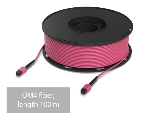 The patch cord is equipped with OM4 fiber, allowing it to be used for 100 Gb/s transmissions without issue. The total cable length is 100 m, with an outer diameter of 3 mm. The jacket is made of LSZH material, and the product is intended for indoor use.