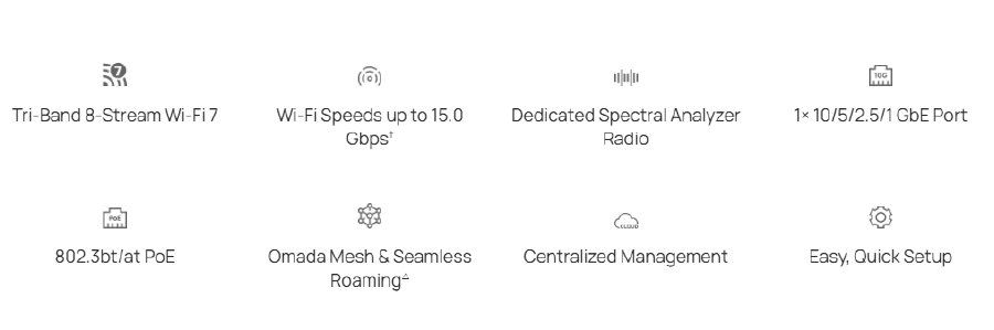 | Antennas | 2.4 GHz: 2× 4.0 dBi 5 GHz: 4× 5.0 dBi 6 GHz: 2× 5.0 dBi |
