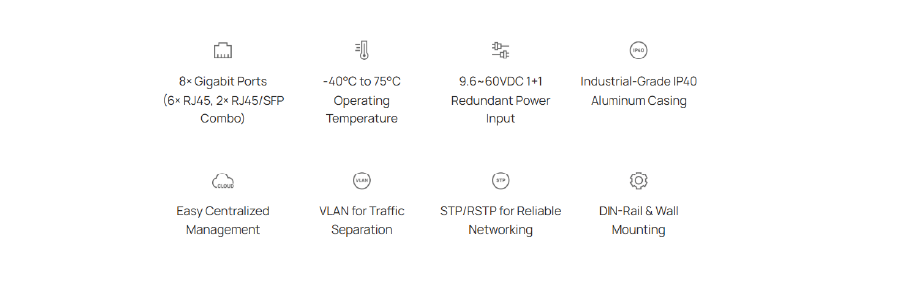 The IES208G industrial managed switch integrates with the Omada SDN system and offers eight Gigabit RJ45 ports providing stable data transmission in local networks. The device features an IP30-rated metal housing suitable for DIN rail mounting and operates passively in a wide temperature range from -40°C to 75°C. The unit ensures high reliability through redundant DC power inputs and supports advanced Layer 2 functions, including VLAN traffic segmentation, QoS prioritization, and STP loop elimination protocols. Management is performed centrally via the Omada platform or through a local GUI interface, making the switch an ideal solution for demanding industrial environments and building automation systems.