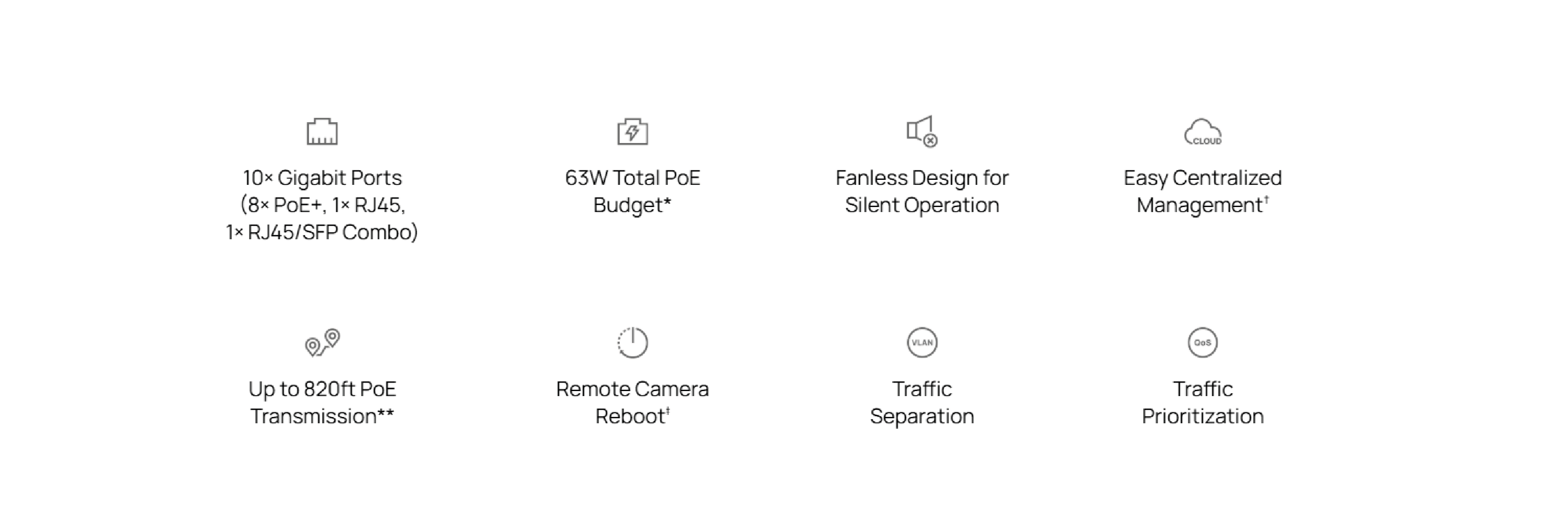 Porty     8 port RJ45 10/100/1000 Mb/s PoE+ (z obsługą 802.3af PoE i 802.3at PoE+)