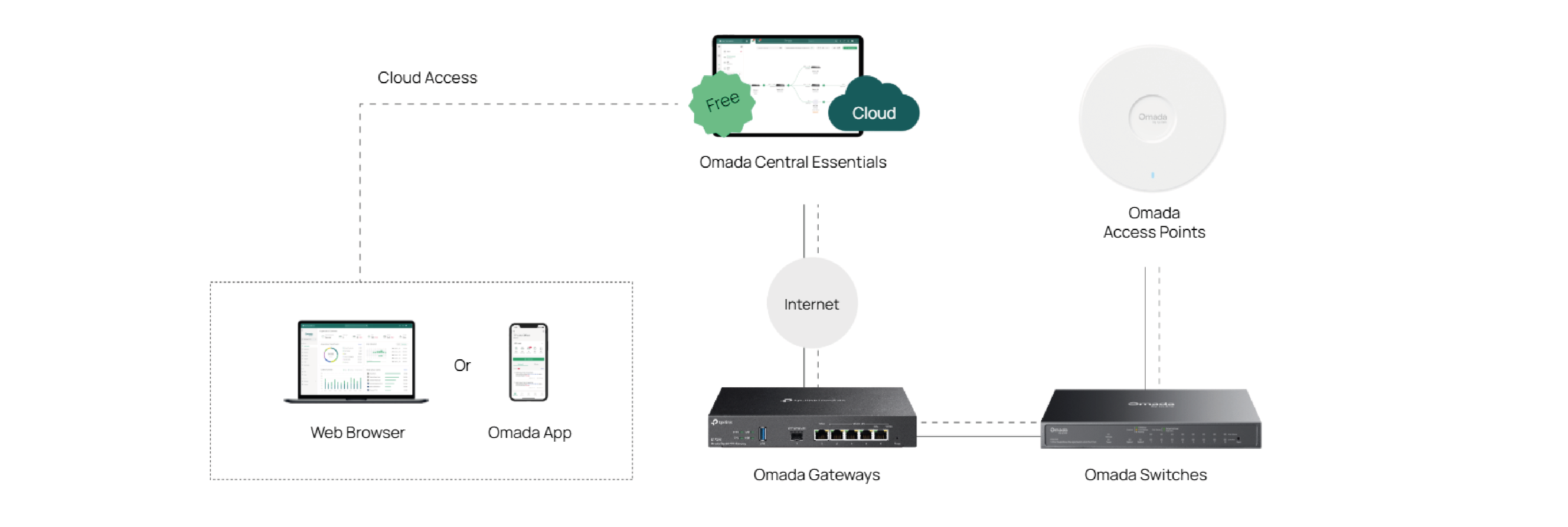 Omada Central Essentials jest bezpłatną wersją Omada Central. Oferuje scentralizowane zarządzanie w chmurze i monitoring dla systemów sieciowych Omada. Obejmuje punkty dostępowe, przełączniki i bramy sieciowe. Jest idealnym rozwiązaniem dla sieci monitoringu oraz małych firm.