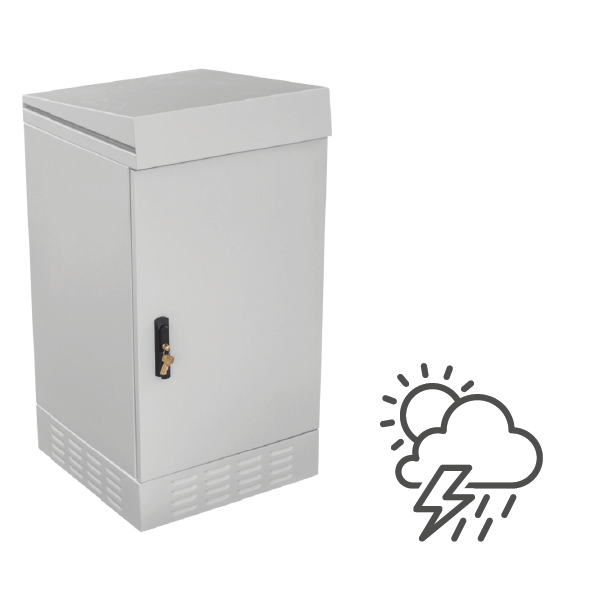 The cabinet features an IP54 protection rating and is designed for outdoor use. The construction is protected against the ingress of water and dust. It is a freestanding cabinet that can be appropriately anchored to the ground (e.g., concrete), mounted on a telecommunications manhole, or placed on a pedestal (sold separately).