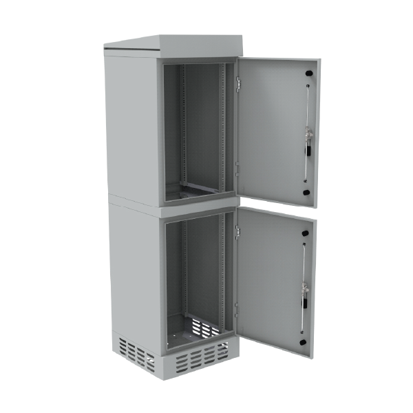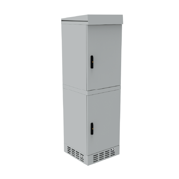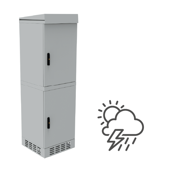 The cabinet features an IP54 protection rating and is suitable for outdoor use. The design is protected against water and dust ingress. As a freestanding cabinet, it can be appropriately anchored to the ground (e.g., concrete), mounted on a telecommunications manhole, or placed on a pedestal (sold separately).