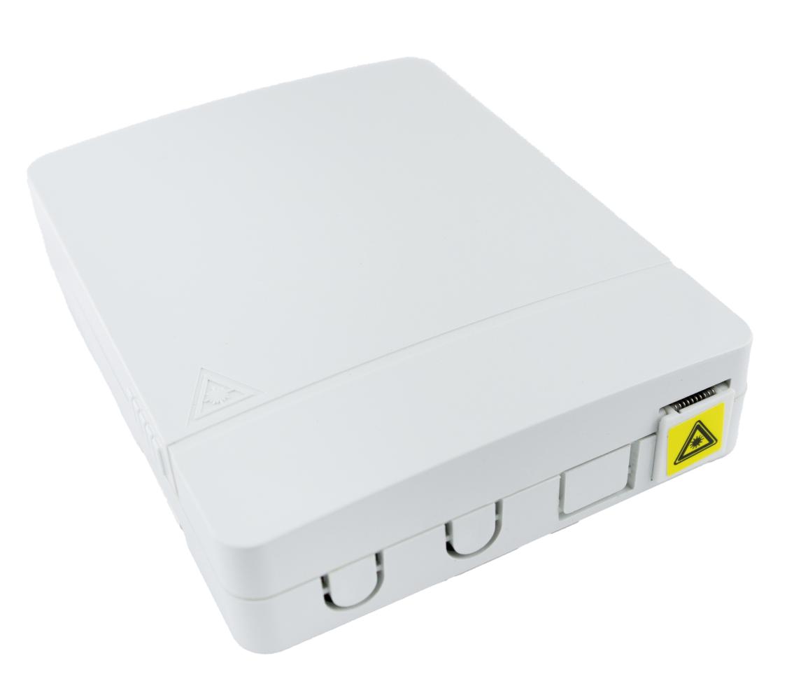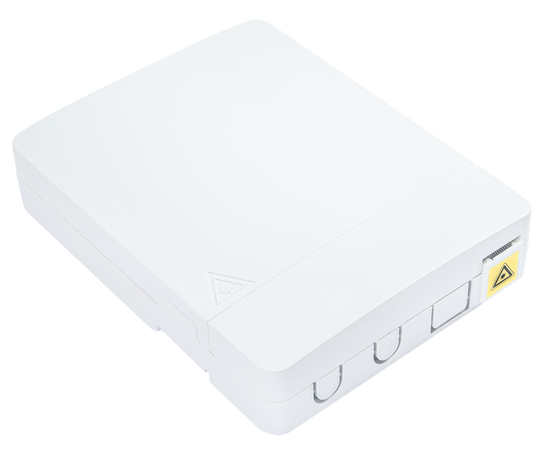 FTB-02D-SCA es una caja de terminación doméstica equipada con un adaptador y pigtail SC/APC (fibra G.652.D). El producto está montado en la pared, en su interior hay una bandeja con lugar para soldaduras y un cable de repuesto.