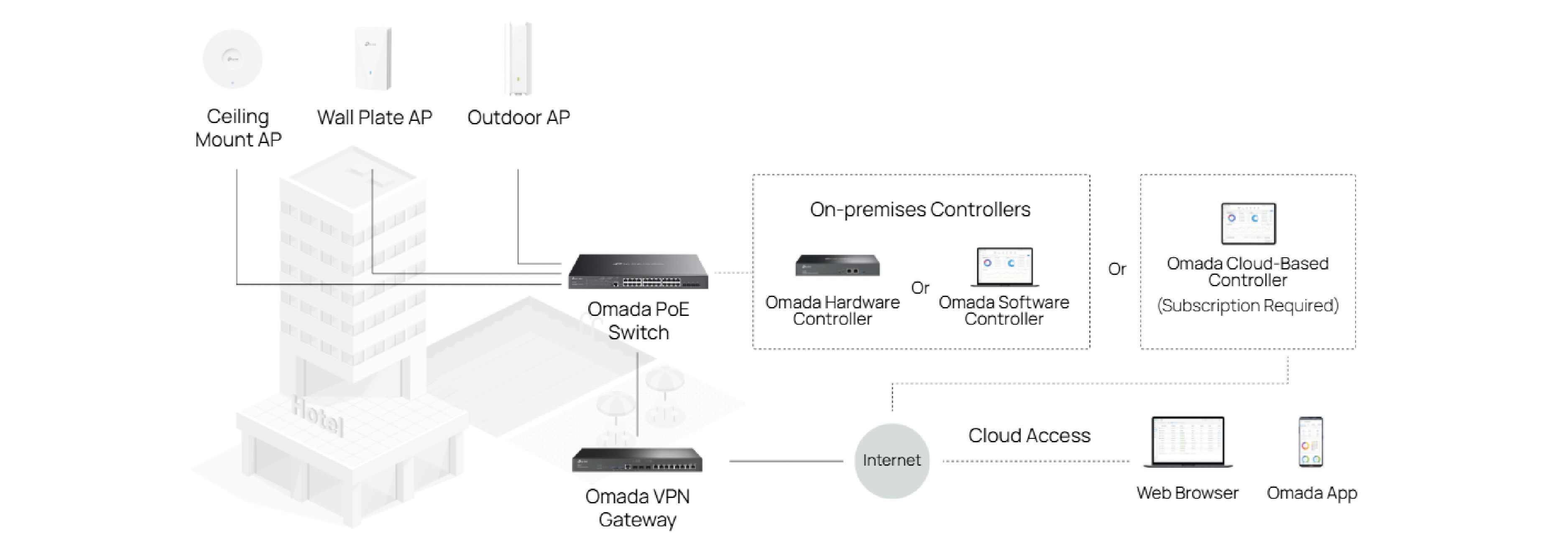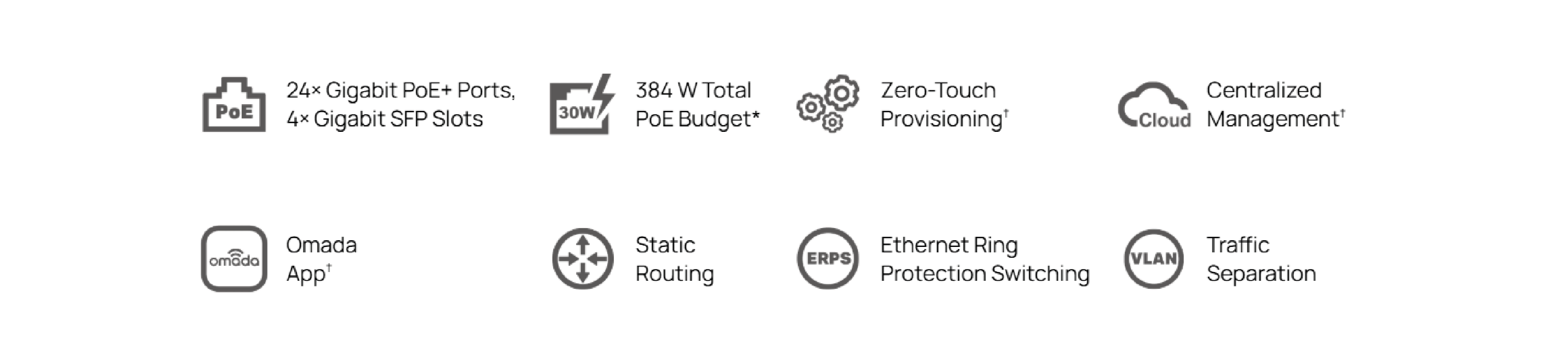 | Advanced Features | • Support Omada Hardware Controller (OC200/OC300), Software Controller, Cloud-Based Controller • Automatic Device Discovery • Batch Configuration • Batch Firmware Upgrading • Intelligent Network Monitoring • Abnormal Event Warnings • Unified Configuration • Reboot Schedule • ZTP (Zero-Touch Provisioning) |